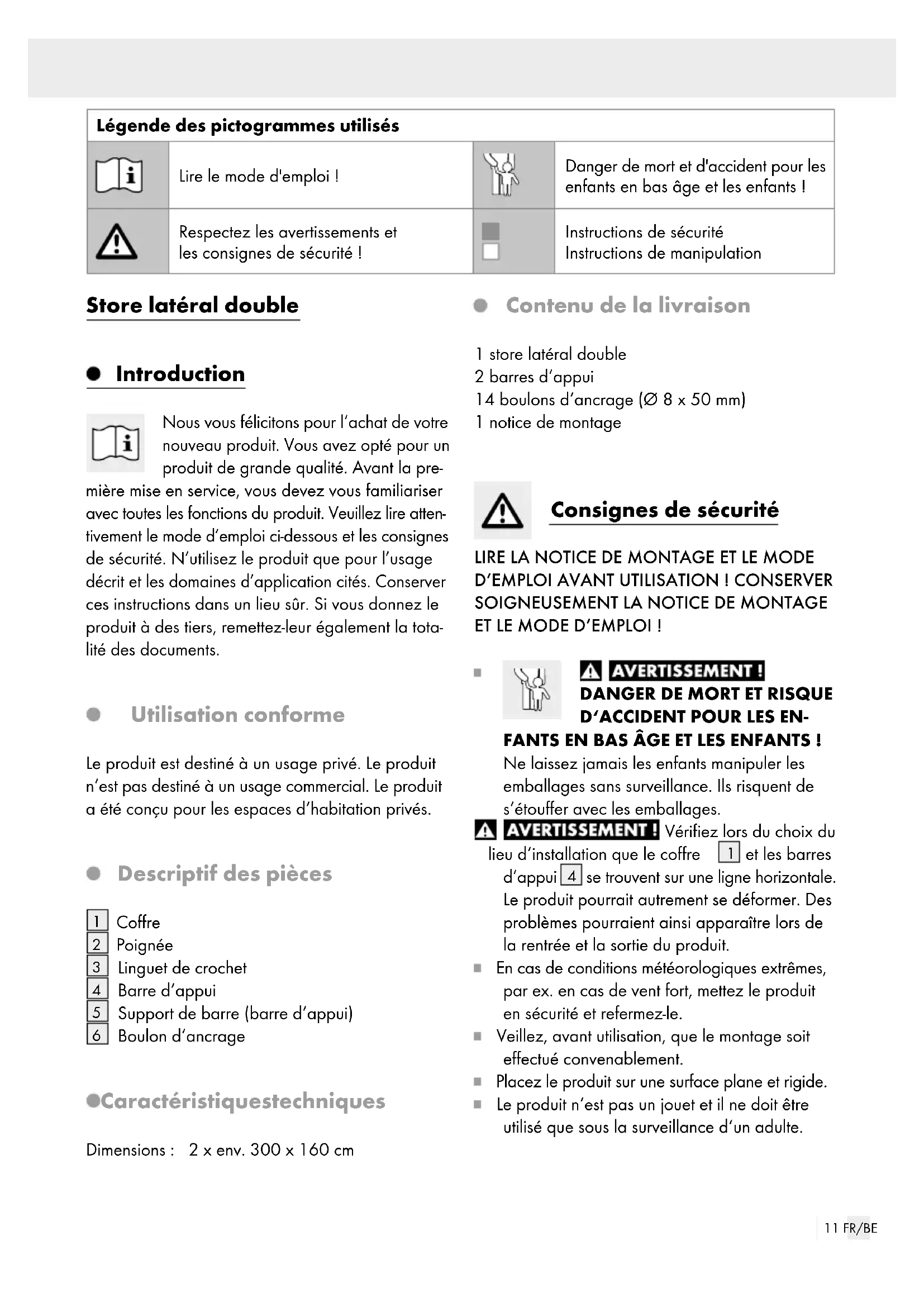 Boulon d‘ancrage Caractéristiques techniques Dimensions: 2 x env. 300 x 160 cm Contenu de la livraison 1 store latéral double 2 barres d‘appui 14 boulons d‘ancrage (Ø 8 x 50 mm) 1 notice de montage Consignes de sécurité LIRE LA NOTICE DE MONTAGE ET LE MODE