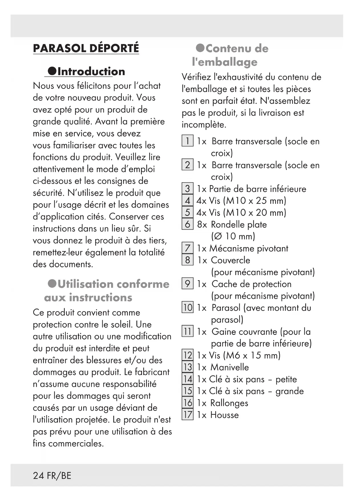 1 1x Barre transversale (socle en croix) 2 1x Barre transversale (socle en croix) 3 1x Partie de barre inférieure 4 4x Vis (M10 x 25 mm) 5 4x Vis (M10 x 20 mm) 6 8x Rondelle pl (10 mm) 7 1x Mécanisme pivotant 8 1x Couvercle (pour mécanisme pivotant) 9 1x Cache de protection (pour mécanisme pivotant) 10 1x Parasol (avec montant du parasol) 11 1x Gaine couvrante (pour la partie de barre inférieure) 12 1x Vis (M6 x 15 mm) 13 1x Manivelle 14 1x Clé à six pans - petite 15 1x Clé à six pans - grande 16 1x Rallonges 17 1x Housse