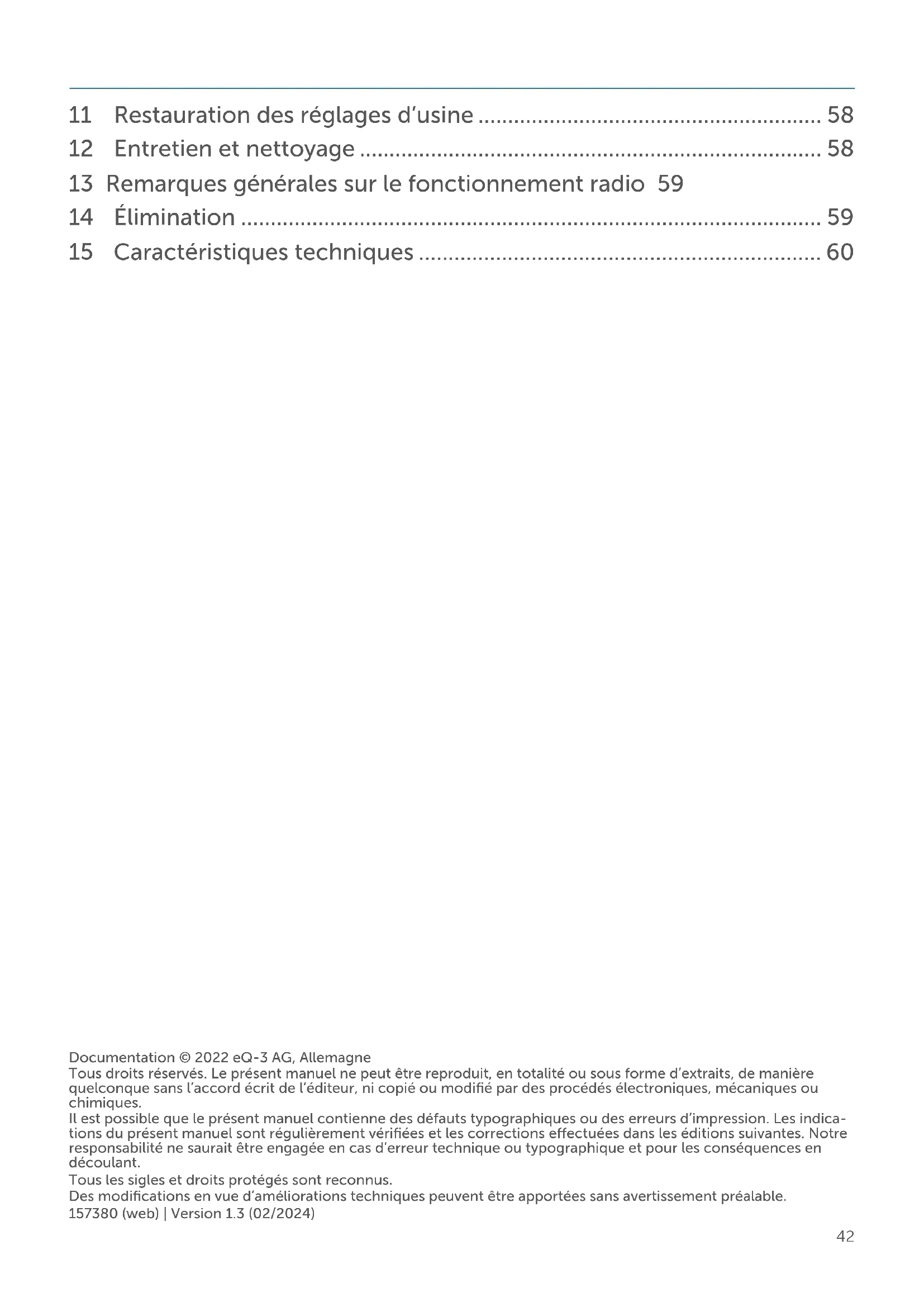 - Documentation © 2022 eQ-3 AG, Allemagne Tous droits réservés. Le présent manuel ne peut être reproduit, en totalité ou sous forme d’extraits, de manière quelconque sans l’accord écrit de l’éditeur, ni copié ou modifié par des procédés électroniques, mécaniques ou chimiques. Il est possible que le présent manuel contienne des défauts typographiques ou des erreurs d’impression. Les indica- tions du présent manuel sont régulièrement vérifiées et les corrections eectuées dans les éditions suivantes. Notre responsabilité ne saurait être engagée en cas d’erreur technique ou typographique et pour les conséquences en découlant. Tous les sigles et droits protégés sont reconnus. Des modifications en vue d’améliorations techniques peuvent être apportées sans avertissement préalable. 157380 (web) | Version 1.3 (02/2024) 11 Restauration des réglages d’usine p. 58