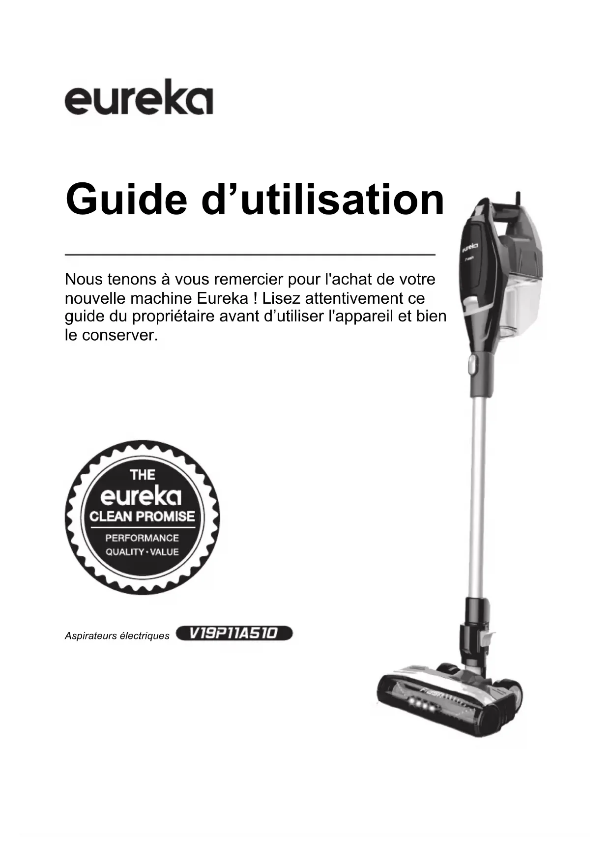 Problème Solution Le moteur ne démarre pas. Insérez fermement la fiche dans une prise, essayez une autre prise ou vérifiez le disjoncteur. Reportez-vous aux instructions détaillées de « coupe-circuit thermique » ci-dessus. La puissance d’aspiration est faible. Videz le bac à poussière et nettoyez ou changez les filtres. Voir page 13 pour les instructions d’entretien. Enlevez la crasse qui limite le flux d’air. Le rouleau brosse ne tourne pas. Enlevez les débris de la brosse rouleau. Voir page 15 pour les instructions d’entretien. Nous orons une garantie limitée de 2 ans. Après-vente-Email: global_service@eureka.comGuía del propietario ¡Gracias por adquirir el nuevo aparato Eureka! Lea detenidamente esta guía de propietario antes de operarlo y guárdela debidamente. Aspiradores eléctricos2