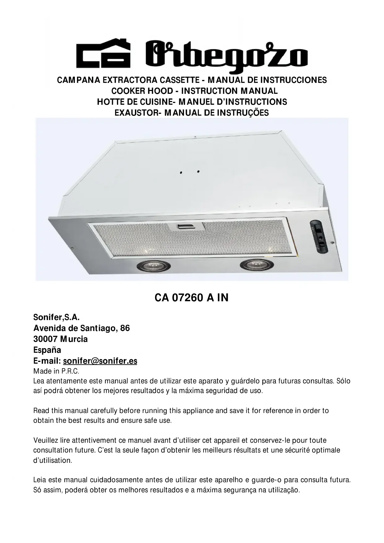 CA 07260 - Hotte Orbegozo - Notice d'utilisation et mode d'emploi gratuit