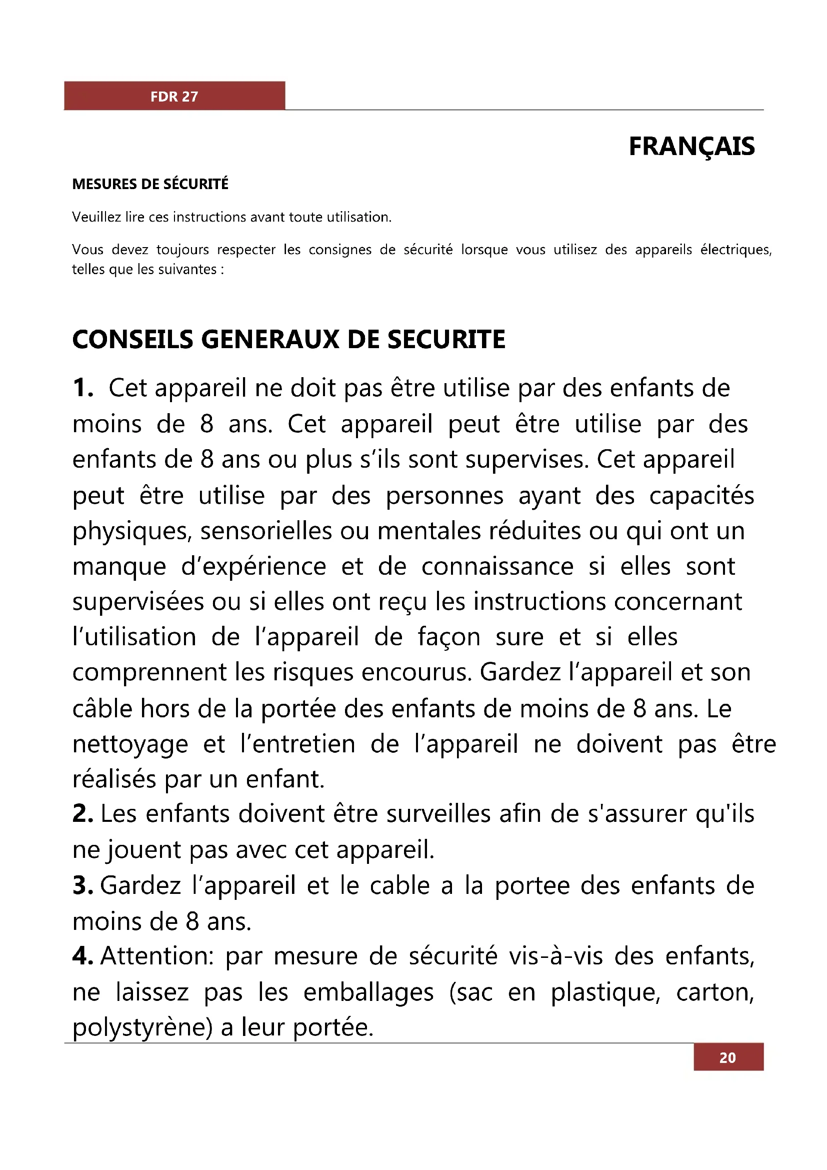 ne laissez pas les emballages (sac en plastique, carton, polystyrène) a leur portée.FDR 27