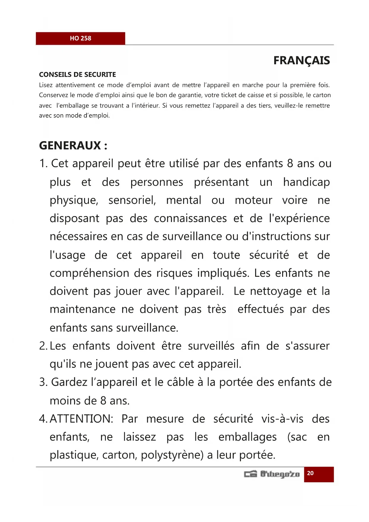 MODE D'EMPLOI HO 258 Orbegozo