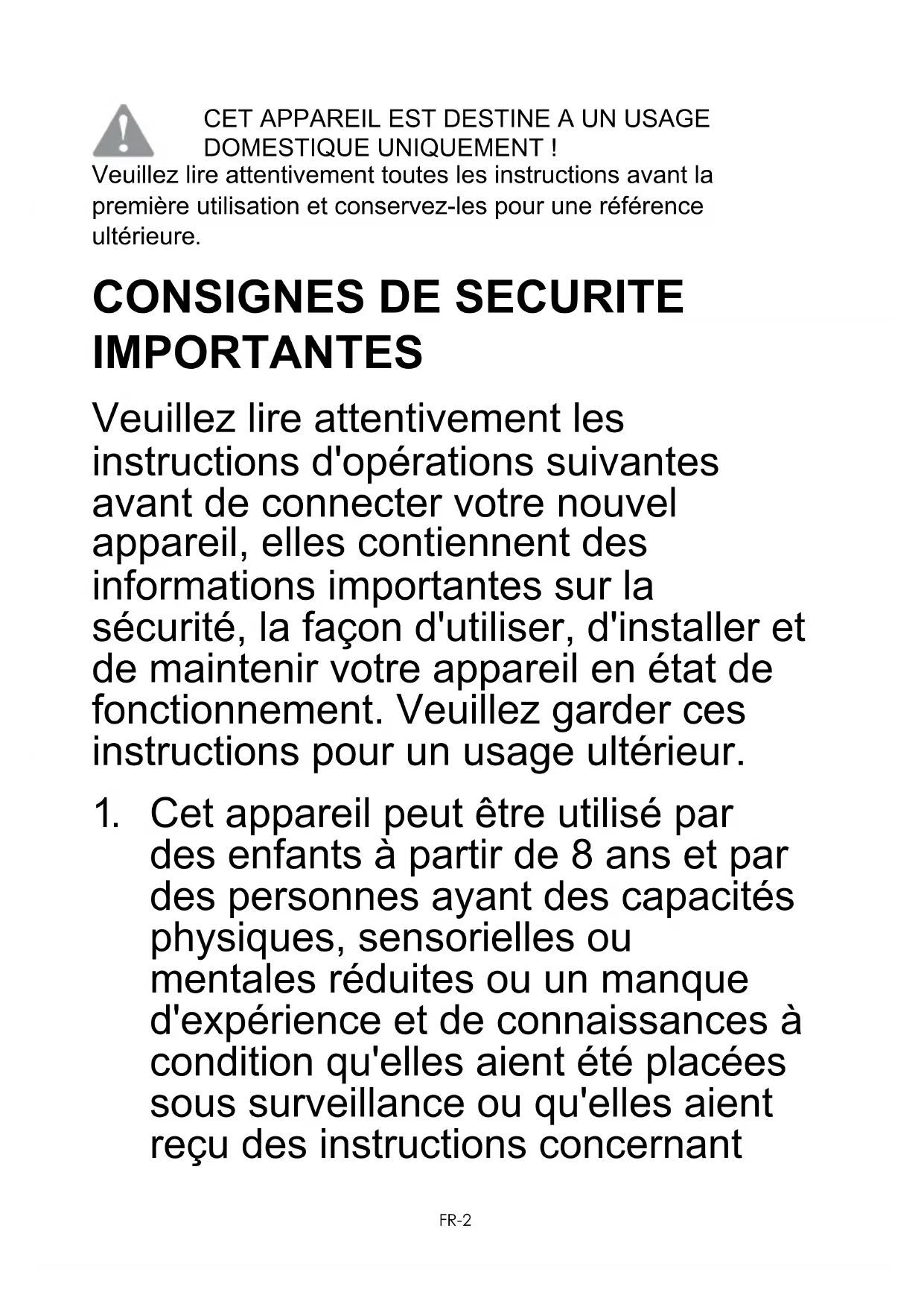 Cet appareil peut être utilisé par des enfants à partir de 8 ans et par des personnes ayant des capacités physiques, sensorielles ou mentales réduites ou un manque d'expérience et de connaissances à condition qu'elles aient été placées sous surveillance ou qu'elles aient reçu des instructions concernantFR-3 l'utilisation de l'appareil en toute sécurité et qu'elles comprennent les dangers encourus. Les enfants ne doivent pas jouer avec l'appareil. Le nettoyage et l'entretien par l'usager ne doivent pas être effectués par des enfants, sans surveillance.