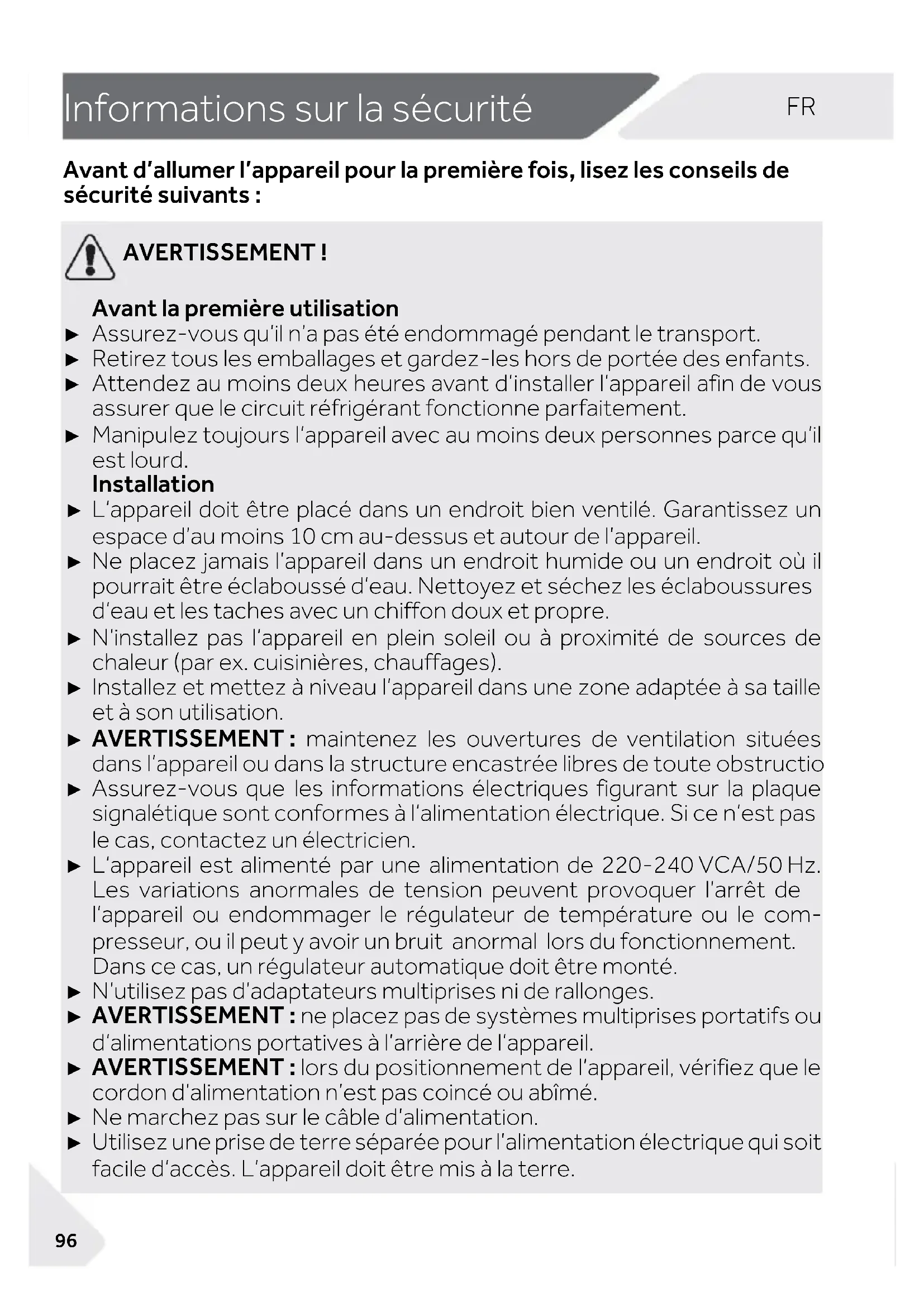 AVERTISSEMENT ! Avant la première utilisation ► Assurez-vous qu’il n’a pas été endommagé pendant le transport. ► Retirez tous les emballages et gardez-les hors de portée des enfants. ► Attendez au moins deux heures avant d’installer l’appareil afin de vous assurer que le circuit réfrigérant fonctionne parfaitement. ► Manipulez toujours l’appareil avec au moins deux personnes parce qu’il est lourd. Installation ► L’appareil doit être placé dans un endroit bien ventilé. Garantissez un espace d’au moins 10 cm au-dessus et autour de l’appareil. ► Ne placez jamais l’appareil dans un endroit humide ou un endroit où il pourrait être éclaboussé d’eau. Nettoyez et séchez les éclaboussures d’eau et les taches avec un chiffon doux et propre. ► N’installez pas l’appareil en plein soleil ou à proximité de sources de chaleur (par ex. cuisinières, chauffages). ► Installez et mettez à niveau l’appareil dans une zone adaptée à sa taille et à son utilisation. ► AVERTISSEMENT : maintenez les ouvertures de ventilation situées dans l’appareil ou dans la structure encastrée libres de toute obstruction. ► Assurez-vous que les informations électriques figurant sur la plaque signalétique sont conformes à l’alimentation électrique. Si ce n’est pas le cas, contactez un électricien. ► L’appareil est alimenté par une alimentation de 220-240 VCA/50 Hz. Les variations anormales de tension peuvent provoquer l’arrêt de l’appareil ou endommager le régulateur de température ou le com- presseur, ou il peut y avoir un bruit anormal lors du fonctionnement. Dans ce cas, un régulateur automatique doit être monté. ► N’utilisez pas d’adaptateurs multiprises ni de rallonges. ► AVERTISSEMENT : ne placez pas de systèmes multiprises portatifs ou d’alimentations portatives à l’arrière de l’appareil. ► AVERTISSEMENT : lors du positionnement de l’appareil, vérifiez que le cordon d’alimentation n’est pas coincé ou abîmé. ► Ne marchez pas sur le câble d’alimentation. ► Utilisez une prise de terre séparée pour l’alimentation électrique qui soit facile d’accès. L’appareil doit être mis à la terre.FR Informations sur la sécurité