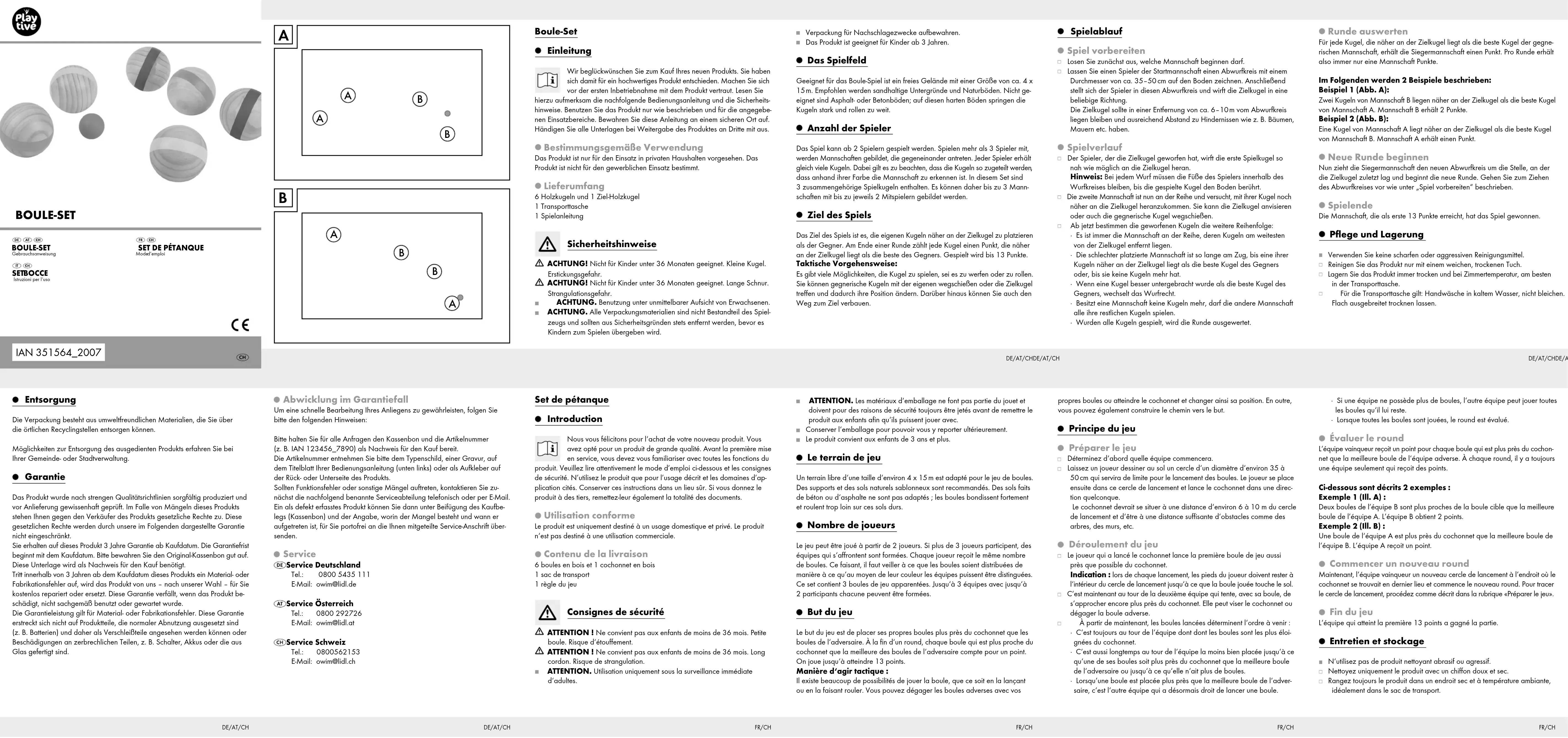 - Es ist immer die Mannschaft an der Reihe, deren Kugeln am weitesten von der Zielkugel entfernt liegen. · Die schlechter platzierte Mannschaft ist so lange am Zug, bis eine ihrer Kugeln näher an der Zielkugel liegt als die beste Kugel des Gegners oder, bis sie keine Kugeln mehr hat. · Wenn eine Kugel besser untergebracht wurde als die beste Kugel des Gegners, wechselt das Wurfrecht. · Besitzt eine Mannschaft keine Kugeln mehr, darf die andere Mannschaft alle ihre restlichen Kugeln spielen. · Wurden alle Kugeln gespielt, wird die Runde ausgewertet. DE/AT/CH DE/AT/CHDE/AT/CHDE/AT/CH Abwicklung im GarantiefallUm eine schnelle Bearbeitung Ihres Anliegens zu gewährleisten, folgen Sie bitte den folgenden Hinweisen:Bitte halten Sie für alle Anfragen den Kassenbon und die Artikelnummer (z. B. IAN 123456_7890) als Nachweis für den Kauf bereit.Die Artikelnummer entnehmen Sie bitte dem Typenschild, einer Gravur, auf dem Titelblatt Ihrer Bedienungsanleitung (unten links) oder als Aufkleber auf der Rück- oder Unterseite des Produkts.Sollten Funktionsfehler oder sonstige Mängel auftreten, kontaktieren Sie zu-nächst die nachfolgend benannte Serviceabteilung telefonisch oder per E-Mail.Ein als defekt erfasstes Produkt können Sie dann unter Beifügung des Kaufbe-legs (Kassenbon) und der Angabe, worin der Mangel besteht und wann er aufgetreten ist, für Sie portofrei an die Ihnen mitgeteilte Service-Anschrift über-senden. Service Service Deutschland Tel.: 0800 5435 111 E-Mail: owim@lidl.de Service Österreich Tel.: 0800 292726 E-Mail: owim@lidl.at Service Schweiz Tel.: 0800562153 E-Mail: owim@lidl.ch Entsorgung Die Verpackung besteht aus umweltfreundlichen Materialien, die Sie über die örtlichen Recyclingstellen entsorgen können.Möglichkeiten zur Entsorgung des ausgedienten Produkts erfahren Sie bei Ihrer Gemeinde- oder Stadtverwaltung. Garantie Das Produkt wurde nach strengen Qualitätsrichtlinien sorgfältig produziert und vor Anlieferung gewissenhaft geprüft. Im Falle von Mängeln dieses Produkts stehen Ihnen gegen den Verkäufer des Produkts gesetzliche Rechte zu. Diese gesetzlichen Rechte werden durch unsere im Folgenden dargestellte Garantie nicht eingeschränkt.Sie erhalten auf dieses Produkt 3 Jahre Garantie ab Kaufdatum. Die Garantiefrist beginnt mit dem Kaufdatum. Bitte bewahren Sie den Original-Kassenbon gut auf. Diese Unterlage wird als Nachweis für den Kauf benötigt.Tritt innerhalb von 3 Jahren ab dem Kaufdatum dieses Produkts ein Material- oder Fabrikationsfehler auf, wird das Produkt von uns – nach unserer Wahl – für Sie kostenlos repariert oder ersetzt. Diese Garantie verfällt, wenn das Produkt be-schädigt, nicht sachgemäß benutzt oder gewartet wurde.Die Garantieleistung gilt für Material- oder Fabrikationsfehler. Diese Garantie erstreckt sich nicht auf Produktteile, die normaler Abnutzung ausgesetzt sind (z. B. Batterien) und daher als Verschleißteile angesehen werden können oder Beschädigungen an zerbrechlichen Teilen, z. B. Schalter, Akkus oder die aus Glas gefertigt sind. Verpackung für Nachschlagezwecke aufbewahren. Das Produkt ist geeignet für Kinder ab 3 Jahren. Das Spielfeld Geeignet für das Boule-Spiel ist ein freies Gelände mit einer Größe von ca. 4 x 15 m. Empfohlen werden sandhaltige Untergründe und Naturböden. Nicht ge-eignet sind Asphalt- oder Betonböden; auf diesen harten Böden springen die Kugeln stark und rollen zu weit. Anzahl der Spieler Das Spiel kann ab 2 Spielern gespielt werden. Spielen mehr als 3 Spieler mit, werden Mannschaften gebildet, die gegeneinander antreten. Jeder Spieler erh ält gleich viele Kugeln. Dabei gilt es zu beachten, dass die Kugeln so zugeteilt werden dass anhand ihrer Farbe die Mannschaft zu erkennen ist. In diesem Set sind 3 zusammengehörige Spielkugeln enthalten. Es können daher bis zu 3 Mann-schaften mit bis zu jeweils 2 Mitspielern gebildet werden. Ziel des Spiels Das Ziel des Spiels ist es, die eigenen Kugeln näher an der Zielkugel zu platzieren als der Gegner. Am Ende einer Runde zählt jede Kugel einen Punkt, die näher an der Zielkugel liegt als die beste des Gegners. Gespielt wird bis 13 Punkte.Taktische Vorgehensweise:Es gibt viele Möglichkeiten, die Kugel zu spielen, sei es zu werfen oder zu rollen. Sie können gegnerische Kugeln mit der eigenen wegschießen oder die Zielkugel treffen und dadurch ihre Position ändern. Darüber hinaus können Sie auch den Weg zum Ziel verbauen. Boule-Set Einleitung Wir beglückwünschen Sie zum Kauf Ihres neuen Produkts. Sie haben sich damit für ein hochwertiges Produkt entschieden. Machen Sie sich vor der ersten Inbetriebnahme mit dem Produkt vertraut. Lesen Sie hierzu aufmerksam die nachfolgende Bedienungsanleitung und die Sicherheits-hinweise. Benutzen Sie das Produkt nur wie beschrieben und für die angegebe-nen Einsatzbereiche. Bewahren Sie diese Anleitung an einem sicheren Ort auf. Händigen Sie alle Unterlagen bei Weitergabe des Produktes an Dritte mit aus. Bestimmungsgemäße VerwendungDas Produkt ist nur für den Einsatz in privaten Haushalten vorgesehen. Das Produkt ist nicht für den gewerblichen Einsatz bestimmt. Lieferumfang6 Holzkugeln und 1 Ziel-Holzkugel1 Transporttasche1 Spielanleitung Sicherheitshinweise ACHTUNG! Nicht für Kinder unter 36 Monaten geeignet. Kleine Kugel. Erstickungsgefahr. ACHTUNG! Nicht für Kinder unter 36 Monaten geeignet. Lange Schnur. Strangulationsgefahr. ACHTUNG. Benutzung unter unmittelbarer Aufsicht von Erwachsenen. ACHTUNG. Alle Verpackungsmaterialien sind nicht Bestandteil des Spiel- zeugs und sollten aus Sicherheitsgründen stets entfernt werden, bevor es Kindern zum Spielen übergeben wird.FR/CH · Si une équipe ne possède plus de boules, l‘autre équipe peut jouer toutes les boules qu‘il lui reste. · Lorsque toutes les boules sont jouées, le round est évalué. Évaluer le round L‘équipe vainqueur reçoit un point pour chaque boule qui est plus près du coc hon- net que la meilleure boule de l