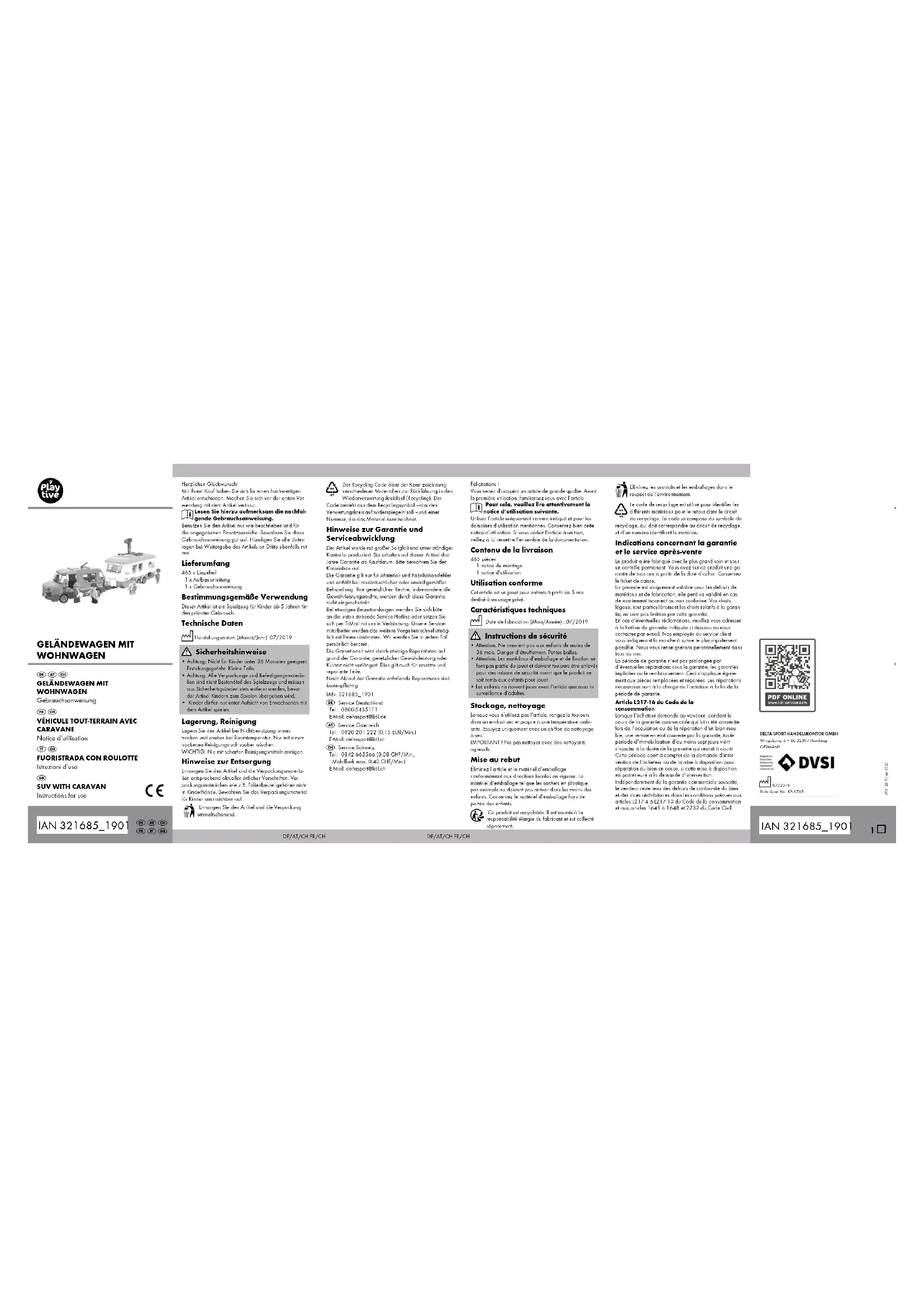 - s‘il présente les qualités qu‘un acheteur peut légitime- ment attendre eu égard aux déclarations publiques faites par le vendeur, par le producteur ou par son représentant, notamment dans la publicité ou l‘étique- tage ; 2° Ou s‘il présente les caractéristiques définies d‘un commun accord par les parties ou être propre à tout usa- ge spécial recherché par l‘acheteur, porté à la connais- sance du vendeur et que ce dernier a accepté. Article L217-12 du Code de la consommation L‘action résultant du défaut de conformité se prescrit par deux ans à compter de la délivrance du bien. Article 1641 du Code civil Le vendeur est tenu de la garantie à raison des défauts cachés de la chose vendue qui la rendent impropre à l‘usage auquel on la destine, ou qui diminu- ent tellement cet usage que l‘acheteur ne l‘aurait pas acquise, ou n‘en aurait donné qu‘un moindre prix, s‘il les avait connus. Article 1648 1er alinéa du Code civil L‘action résultant des vices rédhibitoires doit être intentée par l‘acquéreur dans un délai de deux ans à compter de la découverte du vice. Les pièces détachées indispensables à l’utilisation du produit sont disponibles pendant la durée de la garantie du produit. IAN : 321685_1901 Service Suisse Tel. : 0842 665566 (0,08 CHF/Min., mobile max. 0,40 CHF/Min.) E-Mail : deltasport@lidl.ch Congratulazioni! Avete acquistato un articolo di alta qualità. Consigliamo di familiarizzare con l’articolo prima di cominciare ad utilizzarlo. Leggere attentamente le seguenti istruzioni d’uso. Utilizzare l’articolo solo nel modo descritto e per gli ambiti di applicazione indicati. Conservare accurata- mente queste istruzioni d’uso. In caso di trasferimento dell’articolo a terzi, consegnare tutti i documenti insieme all’articolo. Contenuto della confezione 465 x singolo pezzo 1 x istruzioni per il montaggio 1 x istruzioni d‘uso Utilizzo conforme Questo articolo è un giocattolo per l’uso privato per bambini dai 5 anni in su. Dati tecnici Data di produzione (mese/anno): 07/2019 Avvertenze di sicurezza