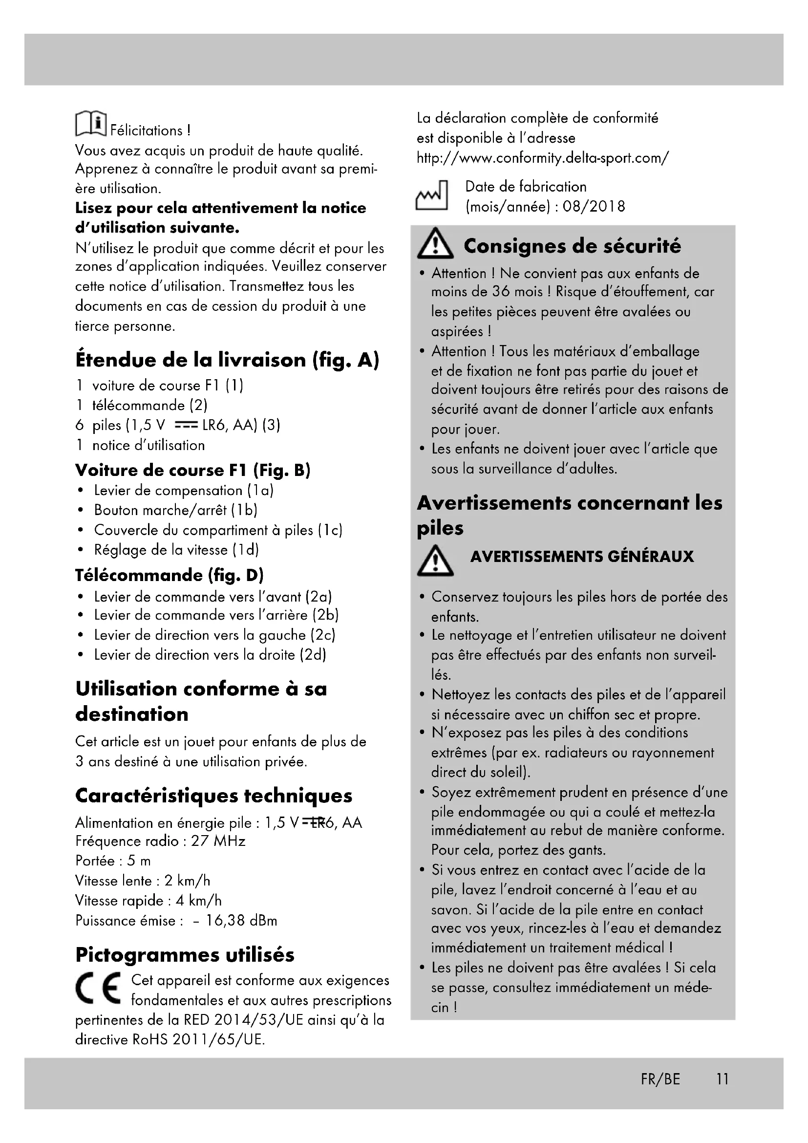 - Levier de direction vers la droite (2d) Utilisation conforme à sa destination Cet article est un jouet pour enfants de plus de 3 ans destiné à une utilisation privée. Caractéristiques techniques Alimentation en énergie pile : 1,5 V LR6, AA Fréquence radio : 27 MHz Portée : 5 m Vitesse lente : 2 km/h Vitesse rapide : 4 km/h Puissance émise : – 16,38 dBm Pictogrammes utilisés Cet appareil est conforme aux exigences fondamentales et aux autres prescriptions pertinentes de la RED 2014/53/UE ainsi qu’à la directive RoHS 2011/65/UE. La déclaration complète de conformité est disponible à l’adresse http://www.conformity.delta-sport.com/ Date de fabrication (mois/année) : 08/2018 Consignes de sécurité