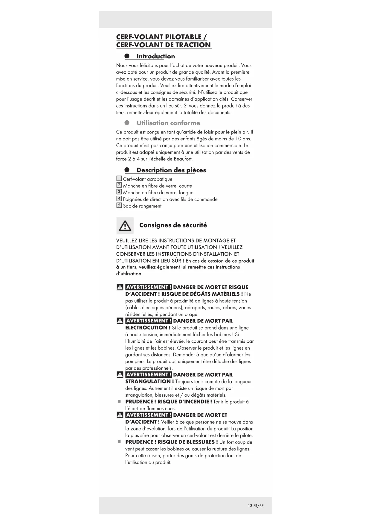 D‘ACCIDENT ! Veiller à ce que personne ne se trouve dans la zone d‘évolution, lors de l‘utilisation du produit. La position la plus sûre pour observer un cerf-volant est derrière le pilote. PRUDENCE ! RISQUE DE BLESSURES ! Un fort coup de vent peut casser les bobines ou causer la rupture des lignes. Pour cette raison, porter des gants de protection lors de l‘utilisation du produit.14 FR/BE