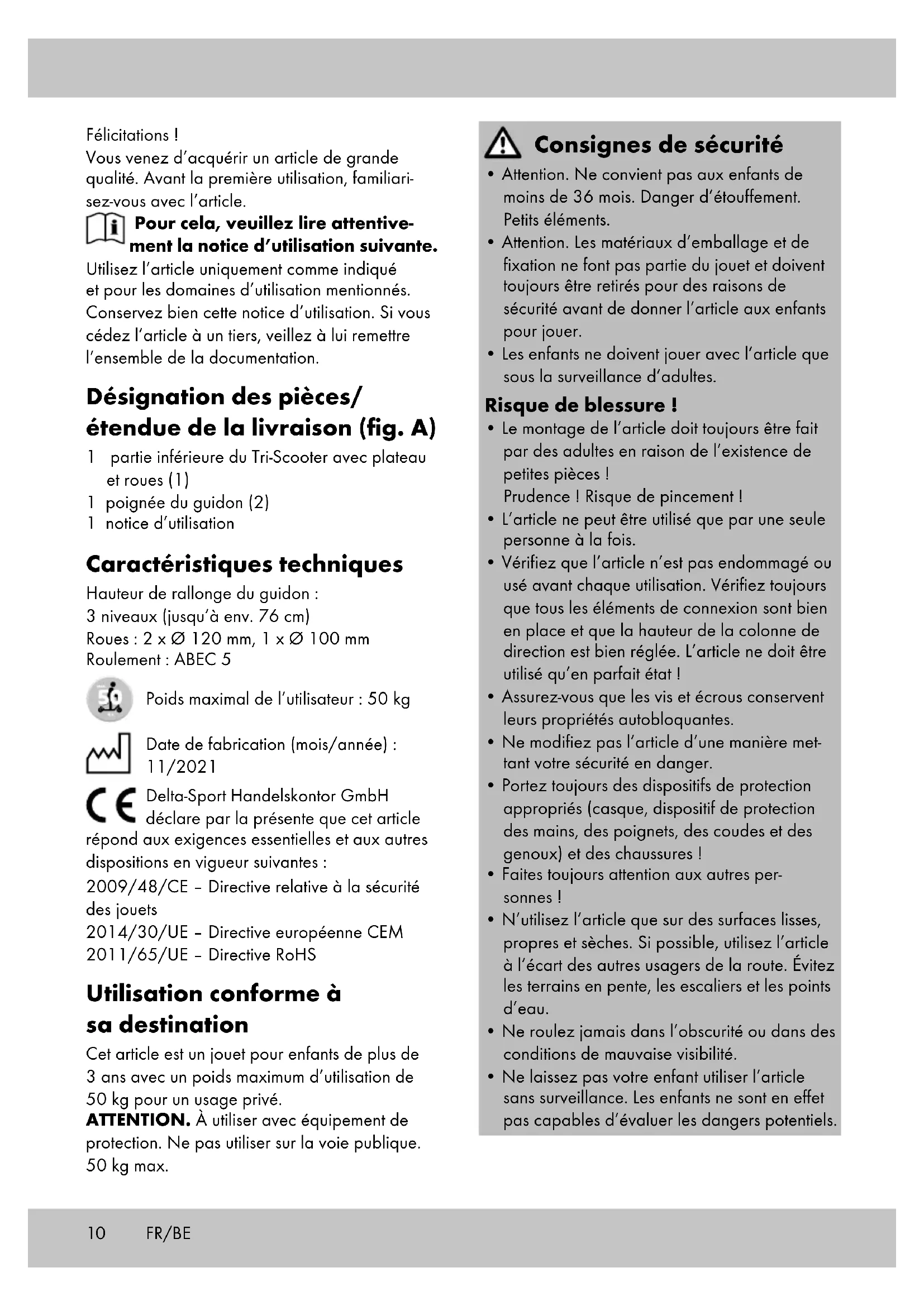avec des vis. Après le remplacement : Assurez-vous que les vis sont toujours serrées dès les premières minutes de conduite et que rien ne s’est desserré ou détaché. Resserrez la roue pour assurer son bon fonctionnement.12 Indications concernant la garantie et le service après- vente L’article a été produit avec grand soin et sous un contrôle constant. DELTA-SPORT HANDELS- KONTOR GmbH accorde au client final privé une garantie de trois ans sur cet article à comp- ter de la date d’achat (période de garantie) conformément aux dispositions suivantes. La garantie ne vaut que pour les défauts de maté- riaux et de fabrication. La garantie ne couvre pas les pièces soumises à une usure normale, lesquelles doivent donc être considérées comme des pièces d’usure (comme par ex. les piles), de même qu’elle ne couvre pas les pièces fragiles, telles que les interrupteurs, les batteries ou les pièces fabriquées en verre. Les réclamations au titre de cette garantie sont exclues si l’article a été utilisé de manière abusive ou inappropriée, hors du cadre de son usage ou du champ d’application prévu ou si les instructions de la notice d’utilisation n’ont pas été respectées, à moins que le client final ne prouve que l´article présentait un défaut de matériau ou de fabrication n´étant pas dû à l’une des conditions mentionnées ci-dessus. Les réclamations au titre de la garantie ne peuvent être adressées pendant la période de garantie qu’en présentant le ticket de caisse original. Veuillez pour cela conserver le ticket de caisse original. Ceci s’applique également aux pièces remplacées et réparées. Si vous avez des plaintes à formuler, veuillez d’abord contacter le service d’assistance télépho- nique ci-dessous ou nous contacter par courrier électronique. Si le cas est couvert par la garantie, nous nous engageons - à notre appréciation - à réparer ou à remplacer l’article gratuitement pour vous ou à vous rembourser le prix d’achat. Aucun autre droit ne découle de la garantie. Vos droits légaux, en particulier les droits de garantie contre le vendeur concerné, ne sont pas limités par cette garantie. Stockage, nettoyage Nous conseillons un nettoyage et un séchage minutieux après utilisation de l’article. Enlevez les petits cailloux ou les autres objets qui ont pu éventuellement coller à vos roues. Conser- vez toujours l’article dans un endroit sec. Mise au rebut Afin de protéger l’environnement, ne jetez pas votre article avec les ordures ménagères lorsqu’il ne vous est plus utile, mais jetez-le de façon appropriée. Vous pouvez obtenir des informations sur les points de collecte et leurs heures d’ouverture auprès des autorités compétentes de votre localité. Les piles/batteries défectueuses ou usagées doivent être recyclées conformément à la directive 2006/66/CE et à ses amendements. Retournez les piles/batteries et/ou l’article à travers les possibilités de collecte offertes. Les matériaux d’emballage comme les sacs plas- tique ne doivent pas tomber entre les mains des enfants. Gardez le matériel d’emballage hors de la portée des enfants. Ce produit est recyclable. Il est soumis à la responsabilité élargie du fabricant et est collecté séparément. Jetez l’article et l’emballage dans le respect de l’environnement. Notez le marquage des matériaux d’emballage lors du tri des déchets. Ceux-ci sont marqués par les abrévia- tions (a) et les chiffres (b) avec la signification suivante : 1 - 7 : plastique/20 - 22 : papier et carton/80 - 98: matériaux composites. L’article et les matériaux d’emballage sont recyclables. Éliminez-les séparément pour une meilleure gestion des déchets. Le logo Triman ne s’applique qu’à la France. Vous pouvez vous renseigner auprès des autorités locales ou muni- cipales pour savoir comment vous débarrasser de l’article mis au rebut. FR/BE13 Article L217-16 du Code de la consommation Lorsque l‘acheteur demande au vendeur, pendant le cours de la garantie commerciale qui lui a été consentie lors de l‘acquisition ou de la réparation d‘un bien meuble, une remise en état couverte par la garantie, toute période d‘immo- bilisation d‘au moins sept jours vient s‘ajouter à la durée de la garantie qui restait à courir. Cette période court à compter de la demande d‘intervention de l‘acheteur ou de la mise à disposition pour réparation du bien en cause, si cette mise à disposition est postérieure à la demande d‘intervention. Indépendamment de la garantie commerciale souscrite, le vendeur reste tenu des défauts de conformité du bien et des vices rédhibitoires dans les conditions prévues aux articles L217-4 à L217-13 du Code de la consommation et aux articles 1641 à 1648 et 2232 du Code Civil. Article L217-4 du Code de la consommation Le vendeur livre un bien conforme au contrat et répond des défauts de conformité existant lors de la délivrance. Il répond également des défauts de conformité résultant de l‘emballage, des instructions de montage ou de l‘installation lorsque celle-ci a été mise à sa charge par le contrat ou a été réalisée sous sa responsabilité. Article L217-5 du Code de la consommation Le bien est conforme au contrat : 1° S´il est propre à l‘usage habituellement attendu d‘un bien semblable et, le cas échéant :