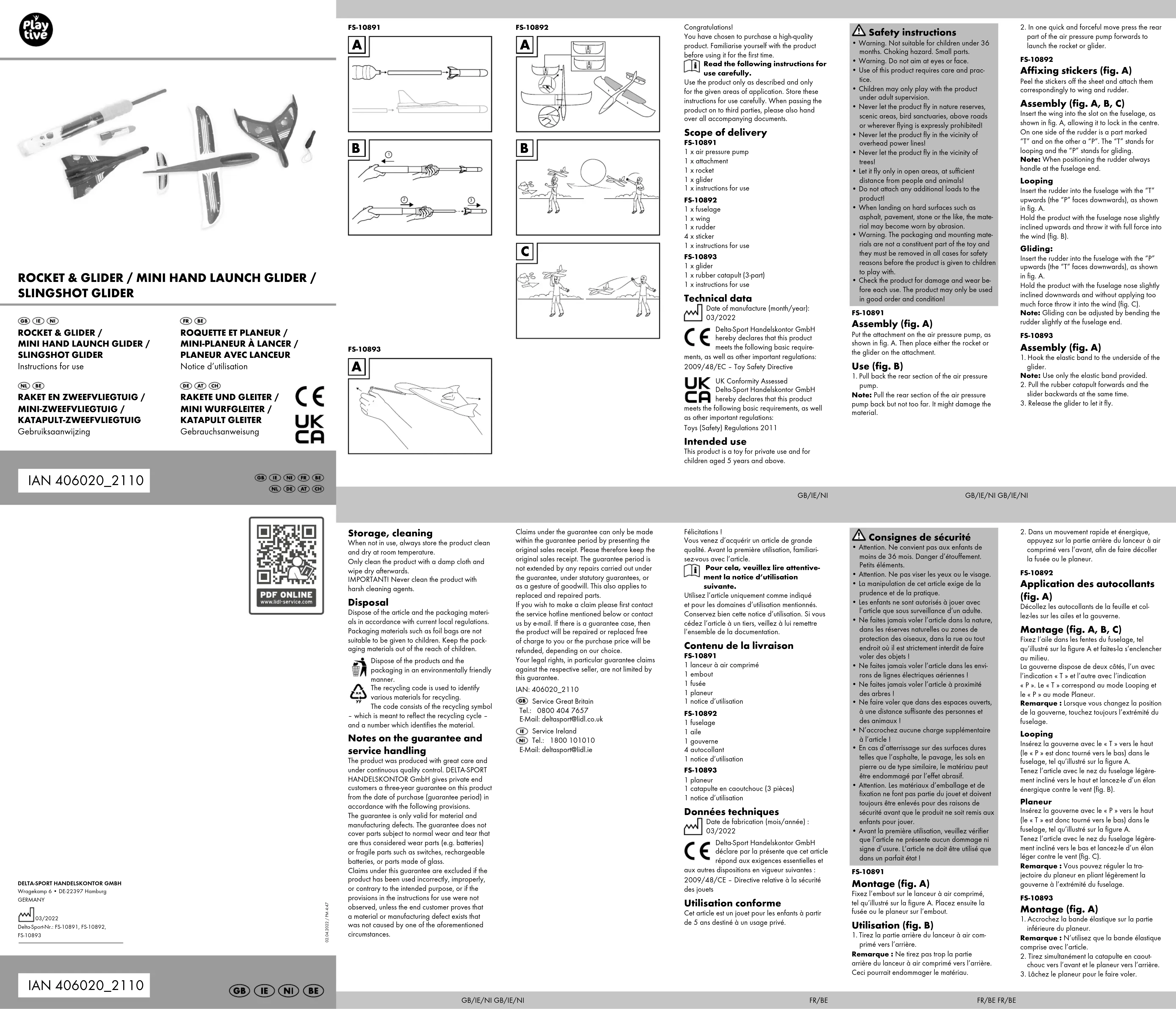 - Attention. Ne convient pas aux enfants de moins de 36 mois. Danger d’étouffement. Petits éléments.• Attention. Ne pas viser les yeux ou le visage.• La manipulation de cet article exige de la prudence et de la pratique.• Les enfants ne sont autorisés à jouer avec l’article que sous surveillance d’un adulte.• Ne faites jamais voler l’article dans la nature, dans les réserves naturelles ou zones de protection des oiseaux, dans la rue ou tout endroit où il est strictement interdit de faire voler des objets !• Ne faites jamais voler l’article dans les envi-rons de lignes électriques aériennes !• Ne faites jamais voler l’article à proximité des arbres !• Ne faire voler que dans des espaces ouverts, à une distance suffisante des personnes et des animaux !• N’accrochez aucune charge supplémentaire à l’article !• En cas d’atterrissage sur des surfaces dures telles que l’asphalte, le pavage, les sols en pierre ou de type similaire, le matériau peut être endommagé par l’effet abrasif.• Attention. Les matériaux d’emballage et de fixation ne font pas partie du jouet et doivent toujours être enlevés pour des raisons de sécurité avant que le produit ne soit remis aux enfants pour jouer.• Avant la première utilisation, veuillez vérifier que l’article ne présente aucun dommage ni signe d’usure. L’article ne doit être utilisé que dans un parfait état !FS-10891 Montage (fig. A) Fixez l’embout sur le lanceur à air comprimé, tel qu’illustré sur la figure A. Placez ensuite la fusée ou le planeur sur l’embout. Utilisation (fig. B) 1. Tirez la partie arrière du lanceur à air com-primé vers l’arrière.Remarque : Ne tirez pas trop la partie arrière du lanceur à air comprimé vers l’arrière. Ceci pourrait endommager le matériau. FR/BE FR/BE2. Dans un mouvement rapide et énergique, appuyez sur la partie arrière du lanceur à air comprimé vers l’avant, afin de faire décoller la fusée ou le planeur.FS-10892 Application des autocollants (fig. A) Décollez les autocollants de la feuille et col-lez-les sur les ailes et la gouverne. Montage (fig. A, B, C) Fixez l’aile dans les fentes du fuselage, tel qu’illustré sur la figure A et faites-la s’enclencher au milieu.La gouverne dispose de deux côtés, l’un avec l’indication « T » et l’autre avec l’indication « P ». Le « T » correspond au mode Looping et le « P » au mode Planeur.Remarque : Lorsque vous changez la position de la gouverne, touchez toujours l’extrémité du fuselage. Looping Insérez la gouverne avec le « T » vers le haut (le « P » est donc tourné vers le bas) dans le fuselage, tel qu’illustré sur la figure A.Tenez l’article avec le nez du fuselage légère-ment incliné vers le haut et lancez-le d’un élan énergique contre le vent (fig. B). Planeur Insérez la gouverne avec le « P » vers le haut (le « T » est donc tourné vers le bas) dans le fuselage, tel qu’illustré sur la figure A.Tenez l’article avec le nez du fuselage légère-ment incliné vers le bas et lancez-le d’un élan léger contre le vent (fig. C).Remarque : Vous pouvez réguler la tra-jectoire du planeur en pliant légèrement la gouverne à l’extrémité du fuselage.FS-10893 Montage (fig. A) 1. Accrochez la bande élastique sur la partie inférieure du planeur. Remarque : N’utilisez que la bande élastique comprise avec l’article. 2. Tirez simultanément la catapulte en caout-chouc vers l’avant et le planeur vers l’arrière. 3. Lâchez le planeur pour le faire voler. FS-10891FS-10893FS-10892