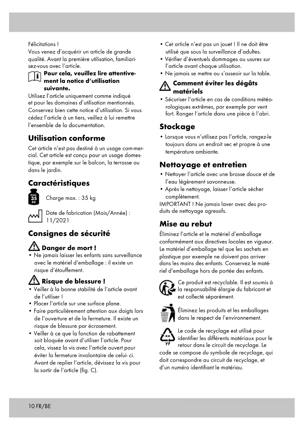 Charge max. : 35 kg Date de fabrication (Mois/Année) : 11/2021 Consignes de sécurité Danger de mort !