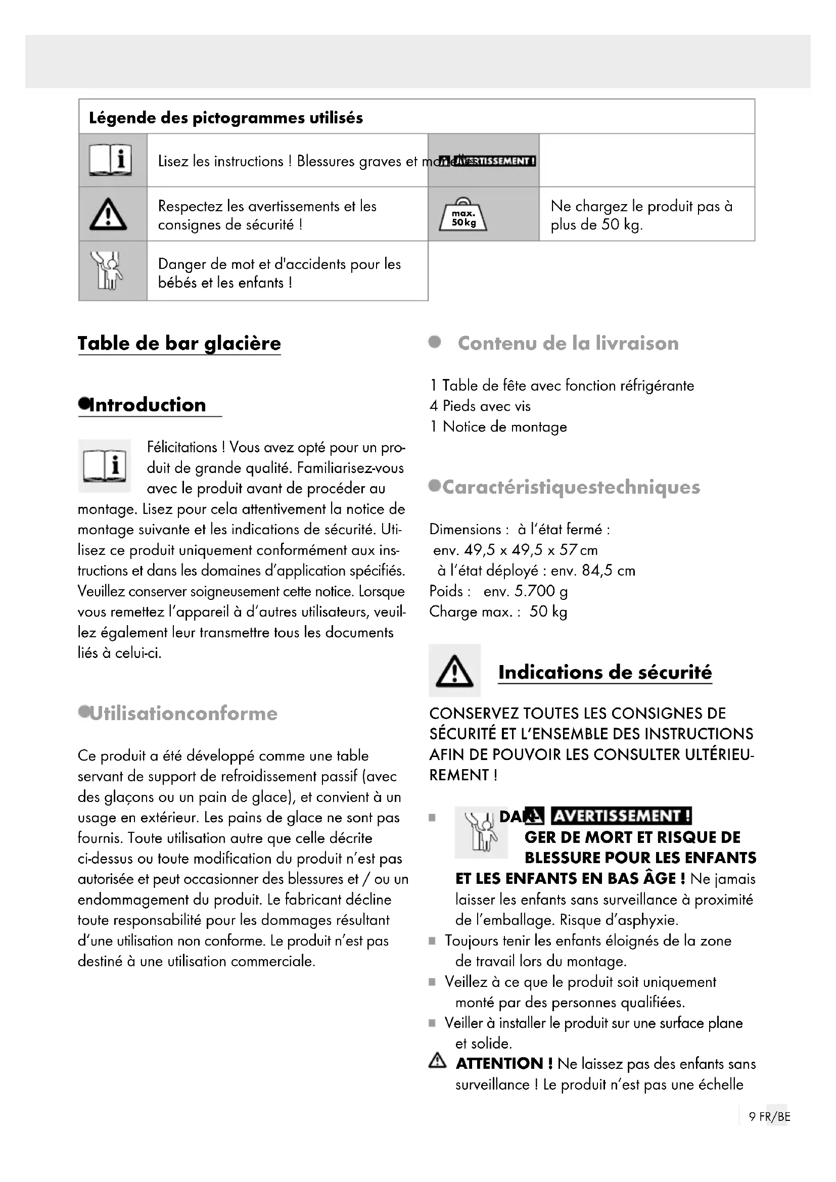ET LES ENFANTS EN BAS ÂGE ! Ne jamais laisser les enfants sans surveillance à proximité de l’emballage. Risque d’asphyxie. Toujours tenir les enfants éloignés de la zone de travail lors du montage. Veillez à ce que le produit soit uniquement monté par des personnes qualifiées. Veiller à installer le produit sur une surface plane et solide. ATTENTION ! Ne laissez pas des enfants sans surveillance! Le produit n’est pas une échelle10 FR/BE ni un jouet! S‘assurer que les personnes, et par- ticulièrement les enfants, n‘escaladent pas le produit ou ne s‘appuient pas dessus. Le produit peut être déséquilibré et basculer. Ceci risque d’engendrer des blessures et / ou des dommages matériels. ATTENTION ! Ne soulevez pas la table ou ne la déplacez pas avec des charges sur elle. Maintenez les enfants à l‘écart du produit, sur- tout lorsque le couvercle est relevé. Un couve rcle retombant peut entraîner des blessures graves à la tête ou sur les mains de l‘enfant. Faites également attention à vos propres mains. Tenir les animaux éloignés du produit. Des ani- maux non surveillés peuvent renverser le produit. Ne pas s’asseoir, ni prendre appui sur le produit. Le produit peut basculer. Il existe un risque de blessures et / ou de dégâts matériels. max. 50 kg Ne pas soumettre le produit à une charge supérieure à 50 kg. Autrem ent, vous risquez de provoquer des bles- sures et / ou d’endommager le produit. Montage Remarque : Montez le produit sur une surface suffisamment grande et résistante aux rayures. Au besoin, recouvrir la surface pour éviter toute rayure. Montez les 4 pieds conformément aux illustra- tions A à D. Pour le système de fermeture, procédez selon les indications des illustrations E à H. Remarque : Relevez le plateau de table jusqu‘au marquage et tournez le système de verrouillage vers la gauche (ill. E + F). Ouvrez/fermez l‘écoulement selon les repré- sentations I à J. Nettoyage et entretien En cas de salissures plus importantes, utilisez un chiffon humide et, le cas échéant, un nettoyant doux. Mise au rebut L’emballage se compose de matières recyclables pouvant être mises au rebut dans les déchetteries locales. Le produit est recyclable, soumis à la responsabilité élargie du fabricant et collecté séparément. Votre mairie ou votre municipalité vous renseigneront sur les possibilités de mise au rebut des produits usagés. Service après-vente Veuillez contacter le fabricant à l‘adresse du service après-vente indiquée. E-Mail : lidl@testritetepro.de IAN 384923_2107 Pour toute demande, veuillez conserver le ticket de caisse et la référence de l‘article (IAN 384923_2107) à titre de preuves d‘achat. Fabricant TEST RITE tepro GmbH Carl-Zeiss-Straße 8/4 63322 Rödermark ALLEMAGNE A00050711 FR/BE Garantie Article L217-16 du Code de la consommation Lorsque l‘acheteur demande au vendeur, pendant le cours de la garantie commerciale qui lui a été consentie lors de l‘acquisition ou de la réparation d‘un bien meuble, une remise en état couverte par la garantie, toute période d‘immobilisation d‘au moins sept jours vient s‘ajouter à la durée de la garantie qui restait à courir. Cette période court à compter de la demande d‘intervention de l‘acheteur ou de la mise à disposition pour réparation du bien en cause, si cette mise à disposition est postérieure à la demande d‘intervention. Indépendamment de la garantie commerciale sous- crite, le vendeur reste tenu des défauts de conformité du bien et des vices rédhibitoires dans les conditions prévues aux articles L217-4 à L217-13 du Code de la consommation et aux articles 1641 à 1648 et 2232 du Code Civil. Article L217-4 du Code de la consommation Le vendeur livre un bien conforme au contrat et ré- pond des défauts de conformité existant lors de la délivrance. Il répond également des défauts de conformité ré- sultant de l‘emballage, des instructions de montage ou de l‘installation lorsque celle-ci a été mise à sa charge par le contrat ou a été réalisée sous sa responsabilité. Article L217-5 du Code de la consommation Le bien est conforme au contrat : 1° S´il est propre à l‘usage habituellement attendu d‘un bien semblable et, le cas échéant : - s‘il correspond à la description donnée par le vendeur et posséder les qualités que celui-ci a présentées à l‘acheteur sous forme d‘échantil- lon ou de modèle ; - s‘il présente les qualités qu‘un acheteur peut légitimement attendre eu égard aux déclara- tions publiques faites par le vendeur, par le producteur ou par son représentant, notam- ment dans la publicité ou l‘étiquetage ; 2° Ou s‘il présente les caractéristiques définies d‘un commun accord par les parties ou être propre à tout usage spécial recherché par l‘acheteur, porté à la connaissance du vendeur et que ce dernier a accepté. Article L217-12 du Code de la consomma- tion L‘action résultant du défaut de conformité se prescrit par deux ans à compter de la délivrance du bien. Article 1641 du Code civil Le vendeur est tenu de la garantie à raison des défauts cachés de la chose vendue qui la rendent impropre à l‘usage auquel on la destine, ou qui diminuent tellement cet usage que l‘acheteur ne l‘aurait pas acquise, ou n‘en aurait donné qu‘un moindre prix, s‘il les avait connus. Article 1648 1er alinéa du Code civil L‘action résultant des vices rédhibitoires doit être intentée par l‘acquéreur dans un délai de deux ans à compter de la découverte du vice. Les pièces détachées indispensables à l’utilisation du produit sont disponibles pendant la durée de la garantie du produit.12 NL/BE Legenda van de gebruikte pictogrammen Instructies lezen! Zwaar tot dodelijk letsel Waarschuwings- en veiligheidsinstructies in acht nemen! max. 50 kg Belast het product niet boven 50 kg. Levensgevaar en kans op ongevallen bij kleuters e