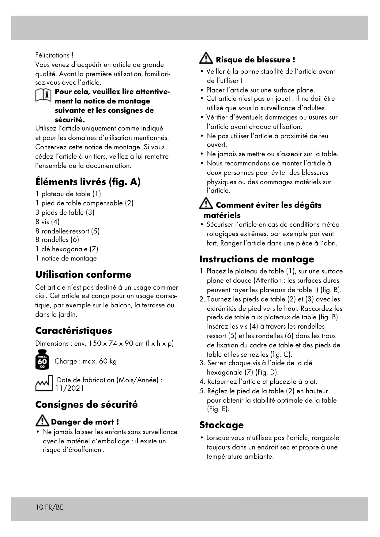 - s‘il présente les qualités qu‘un acheteur peut légitimement attendre eu égard aux déclara- tions publiques faites par le vendeur, par le producteur ou par son représentant, notam- ment dans la publicité ou l‘étiquetage ; 2° Ou s‘il présente les caractéristiques définies d‘un commun accord par les parties ou être propre à tout usage spécial recherché par l‘acheteur, porté à la connaissance du vendeur et que ce dernier a accepté. Article L217-12 du Code de la consommation L‘action résultant du défaut de conformité se prescrit par deux ans à compter de la délivrance du bien. Article 1641 du Code civil Le vendeur est tenu de la garantie à raison des défauts cachés de la chose vendue qui la rendent impropre à l‘usage auquel on la destine, ou qui diminuent tellement cet usage que l‘acheteur ne l‘aurait pas acquise, ou n‘en aurait donné qu‘un moindre prix, s‘il les avait connus. Article 1648 1er alinéa du Code civil L‘action résultant des vices rédhibitoires doit être intentée par l‘acquéreur dans un délai de deux ans à compter de la découverte du vice. Les pièces détachées indispensables à l’utili- sation du produit sont disponibles pendant la durée de la garantie du produit. IAN : 385814_2107 Service France Tel. : 0800 919270 E-Mail : deltasport@lidl.fr Service Belgique Tel. : 070 270 171 (0,15 EUR/Min.) E-Mail : deltasport@lidl.be FR/BE13NL/BE Gefeliciteerd! Met uw aankoop hebt u voor een hoogwaardig artikel gekozen. Zorg ervoor dat u voor het eerste gebruik met het artikel vertrouwd raakt. Lees hiervoor de volgende montagehandleiding en de veiligheidstips zorgvuldig door. Gebruik het artikel alleen zoals omschreven en voor het aangegeven doel. Bewaar deze monta- gehandleiding goed. Geef alle documenten mee als u het artikel aan iemand anders geeft. In het leveringspakket inbegrepen (afb. A) 1 x tafelblad (1) 1 x tafelpoot in hoogte verstelbaar (2) 3 x tafelpoot (3) 8 x schroef (4) 8 x veerring (5) 8 x onderlegplaatje (6) 1 x binnenzeskantsleutel (7) 1 x montagehandleiding Voorgeschreven gebruik Het artikel is niet bestemd voor commercieel ge- bruik. Het artikel is ontworpen voor het gebruik in woongedeelten, bv. balkon, terras of tuin. Technische gegevens Afmetingen: ca. 150 x 74 x 90 cm (b x h x d) Maximale belasting: 60 kg Productiedatum (maand/jaar): 11/2021 Veiligheidsinstructies Levensgevaar!