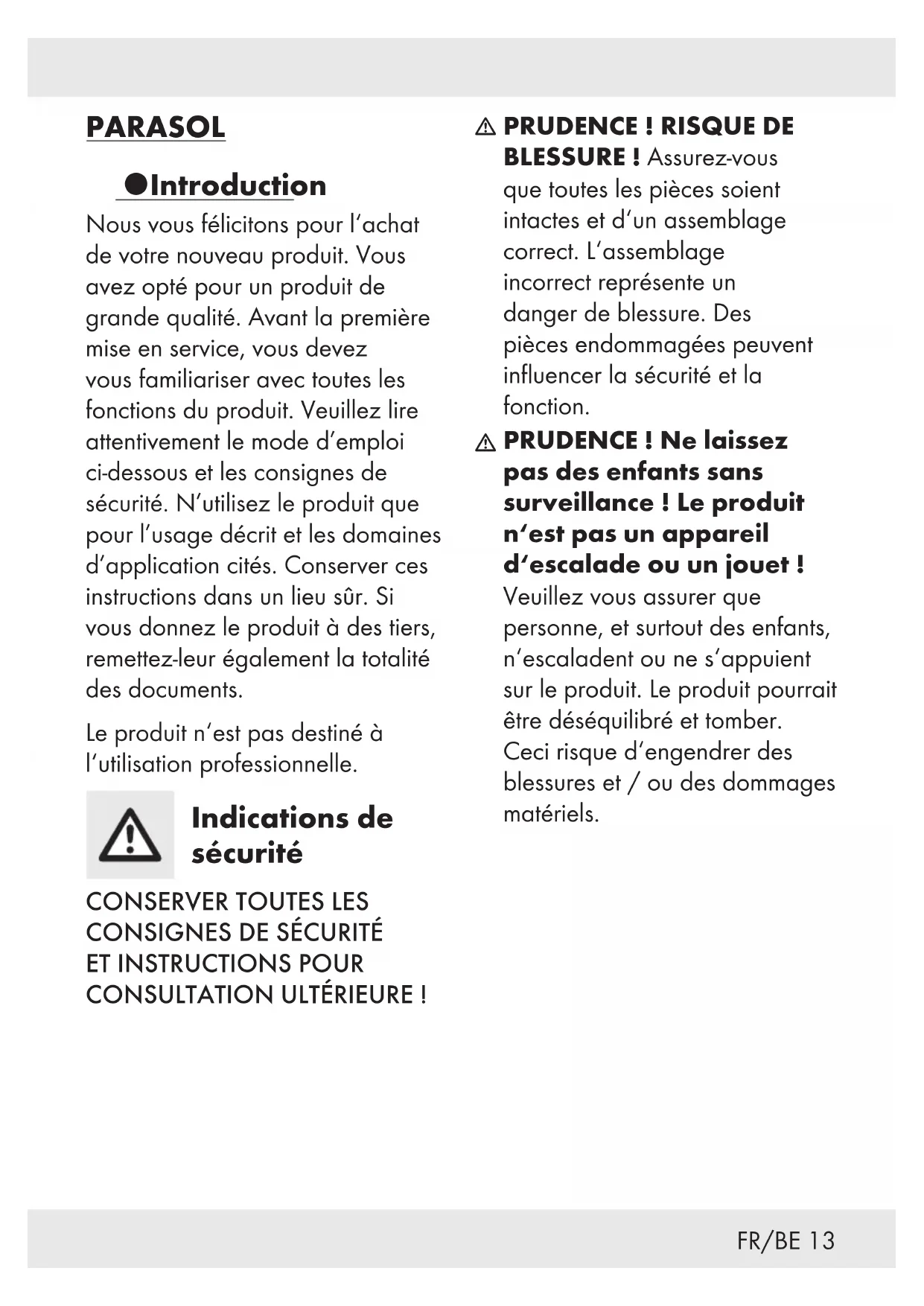 PRUDENCE ! Ne laissez pas des enfants sans surveillance ! Le produit n‘est pas un appareil d‘escalade ou un jouet ! Veuillez vous assurer que personne, et surtout des enfants, n‘escaladent ou ne s‘appuient sur le produit. Le produit pourrait être déséquilibré et tomber. Ceci risque d‘engendrer des blessures et / ou des dommages matériels.14 FR/BE