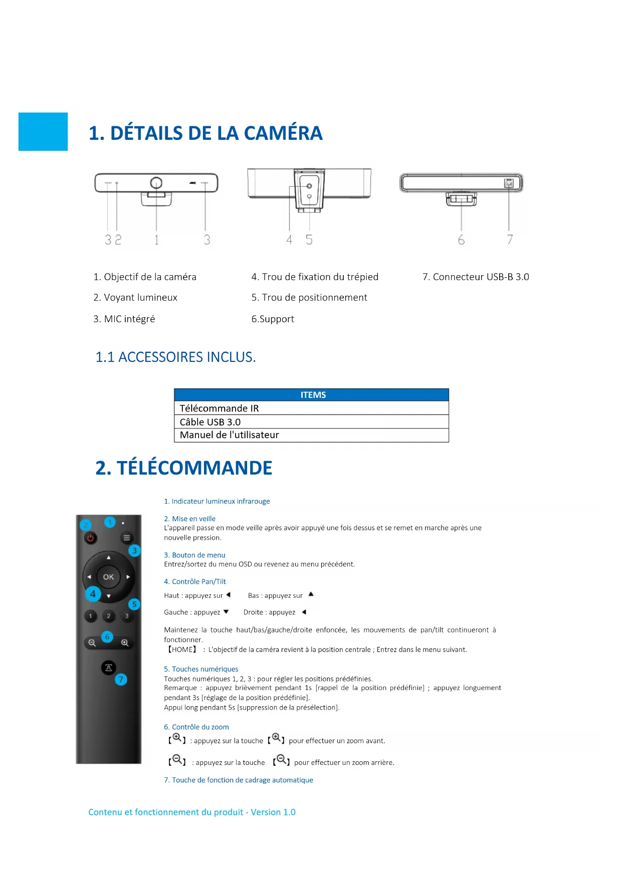de la caméra.Contenu et fonctionnement du produit - Version 1.0