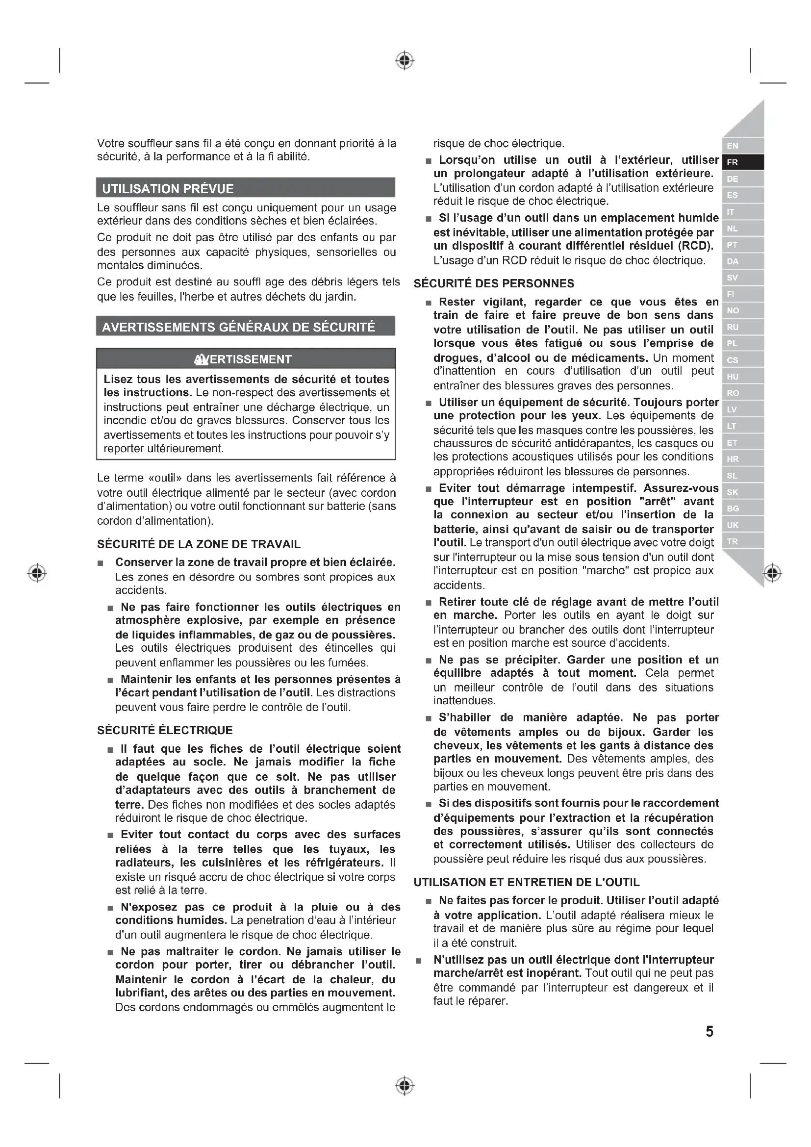 Le souffl eur sans fi l est conçu uniquement pour un usage extérieur dans des conditions sèches et bien éclairées. Ce produit ne doit pas être utilisé par des enfants ou par des personnes aux capacité physiques, sensorielles ou mentales diminuées. Ce produit est destiné au souffl age des débris légers tels que les feuilles, l'herbe et autres déchets du jardin. AVERTISSEMENTS GÉNÉRAUX DE SÉCURITÉ AVERTISSEMENT Lisez tous les avertissements de sécurité et toutes les instructions. Le non-respect des avertissements et instructions peut entraîner une décharge électrique, un incendie et/ou de graves blessures. Conserver tous les avertissements et toutes les instructions pour pouvoir s’y reporter ultérieurement. Le terme «outil» dans les avertissements fait référence à votre outil électrique alimenté par le secteur (avec cordon d’alimentation) ou votre outil fonctionnant sur batterie (sans cordon d’alimentation). SÉCURITÉ DE LA ZONE DE TRAVAIL ■ Conserver la zone de travail propre et bien éclairée. Les zones en désordre ou sombres sont propices aux accidents. ■ Ne pas faire fonctionner les outils électriques en atmosphère explosive, par exemple en présence de liquides inflammables, de gaz ou de poussières. Les outils électriques produisent des étincelles qui peuvent enflammer les poussières ou les fumées. ■ Maintenir les enfants et les personnes présentes à l’écart pendant l’utilisation de l’outil. Les distractions peuvent vous faire perdre le contrôle de l’outil.