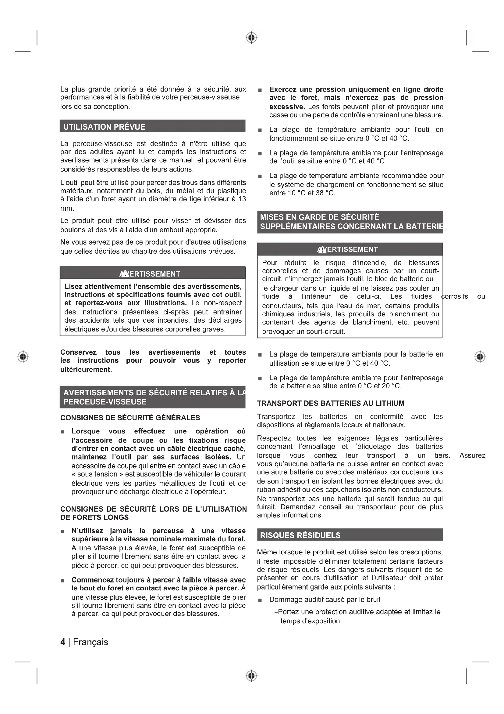 La perceuse-visseuse est destinée à n'être utilisé que par des adultes ayant lu et compris les instructions et avertissements présents dans ce manuel, et pouvant être considérés responsables de leurs actions. L'outil peut être utilisé pour percer des trous dans différents matériaux, notamment du bois, du métal et du plastique à l'aide d'un foret ayant un diamètre de tige inférieur à 13 mm. Le produit peut être utilisé pour visser et dévisser des boulons et des vis à l'aide d'un embout approprié. Ne vous servez pas de ce produit pour d'autres utilisations que celles décrites au chapitre des utilisations prévues. AVERTISSEMENT Lisez attentivement l’ensemble des avertissements, instructions et spécifications fournis avec cet outil, et reportez-vous aux illustrations. Le non-respect des instructions présentées ci-après peut entraîner des accidents tels que des incendies, des décharges pOHFWULTXHVHWRXGHVEOHVVXUHVFRUSRUHOOHVJUDYHV Conservez tous les avertissements et toutes les instructions pour pouvoir vous y reporter ultérieurement.