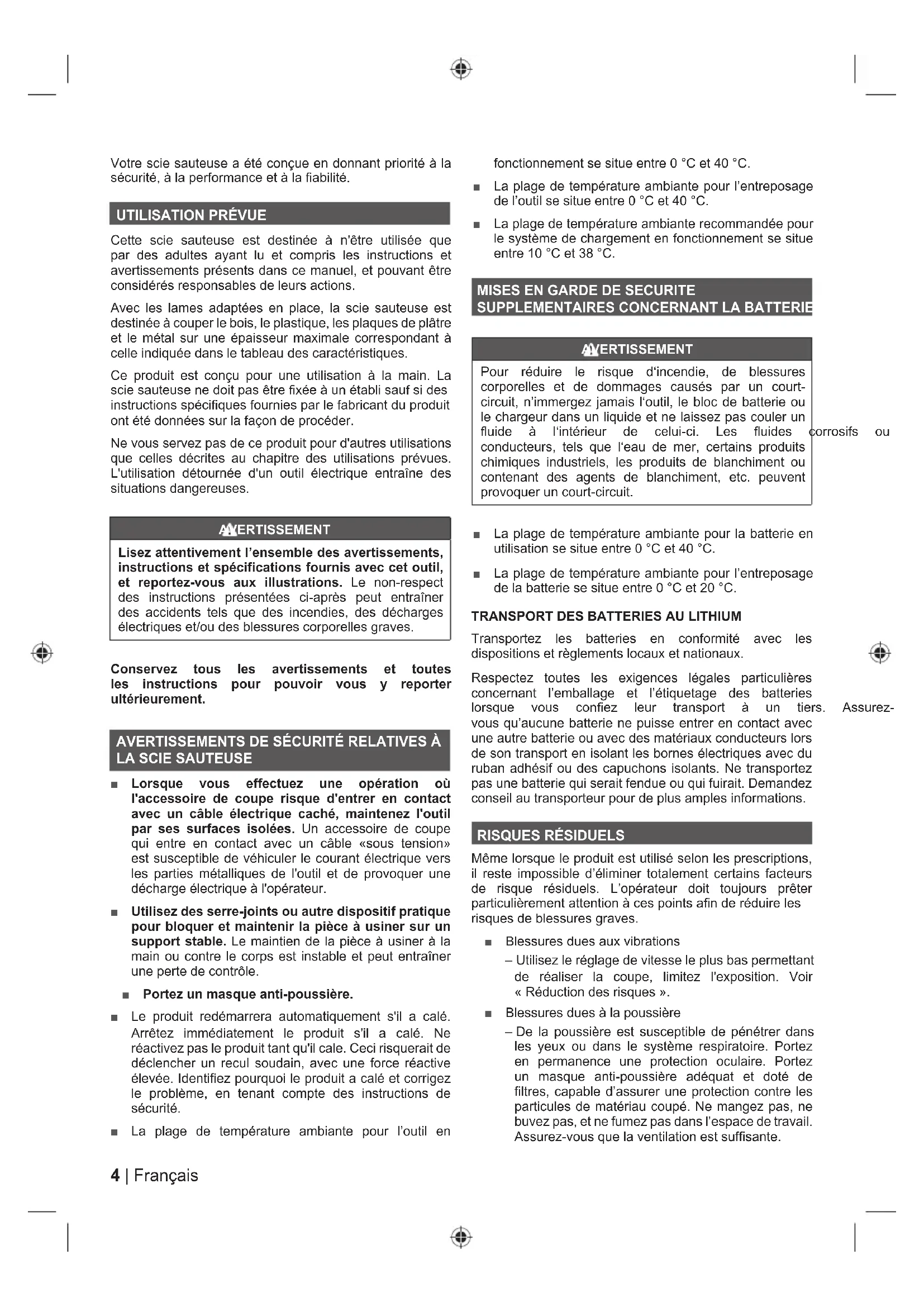 Ŷ Lorsque vous effectuez une opération où l'accessoire de coupe risque d'entrer en contact avec un câble électrique caché, maintenez l'outil par ses surfaces isolées. Un accessoire de coupe qui entre en contact avec un câble «sous tension» est susceptible de véhiculer le courant électrique vers les parties métalliques de l'outil et de provoquer une décharge électrique à l'opérateur. Ŷ Utilisez des serre-joints ou autre dispositif pratique pour bloquer et maintenir la pièce à usiner sur un support stable. Le maintien de la pièce à usiner à la main ou contre le corps est instable et peut entraîner une perte de contrôle. Ŷ Portez un masque anti-poussière. Ŷ Le produit redémarrera automatiquement s'il a calé. Arrêtez immédiatement le produit s'il a calé. Ne réactivez pas le produit tant qu'il cale. Ceci risquerait de déclencher un recul soudain, avec une force réactive élevée. Identifiez pourquoi le produit a calé et corrigez le problème, en tenant compte des instructions de sécurité. Ŷ La plage de température ambiante pour l’outil en fonctionnement se situe entre 0 °C et 40 °C. Ŷ La plage de température ambiante pour l’entreposage de l’outil se situe entre 0 °C et 40 °C. Ŷ La plage de température ambiante recommandée pour le système de chargement en fonctionnement se situe entre 10 °C et 38 °C.