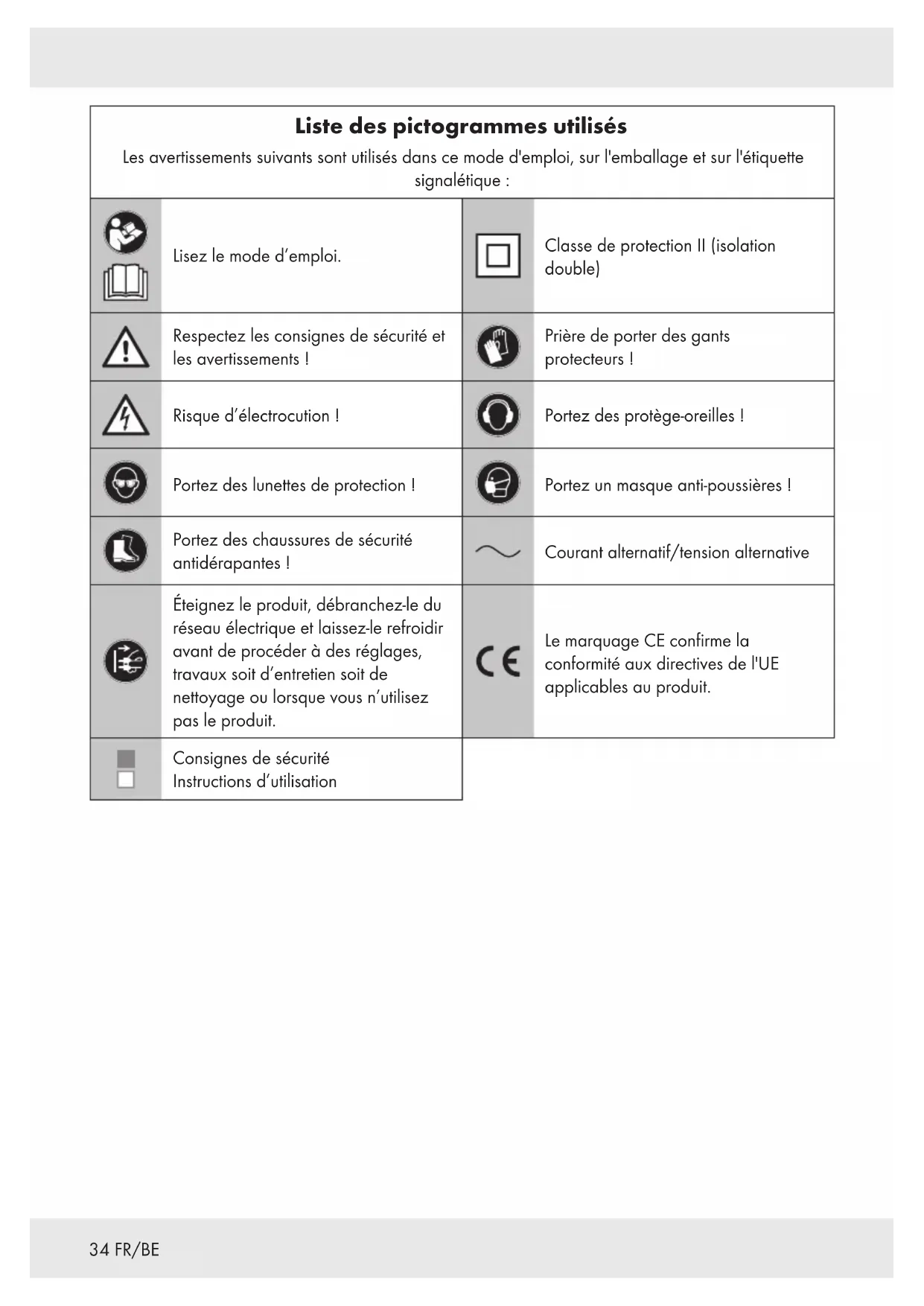 Éteignez le produit, débranchez-le du réseau électrique et laissez-le refroidir avant de procéder à des réglages, travaux soit d’entretien soit de nettoyage ou lorsque vous n’utilisez pas le produit. Le marquageCE confirme la conformité aux directives de l'UE applicables au produit. Consignes de sécurité Instructions d’utilisation35FR/BE GRIGNOTEUSE Introduction Félicitations pour l’achat de votre nouveau produit, ci-après dénommé uniquement «le produit». Vous avez choisi un produit de haute qualité. Le manuel d’utilisation fait partie intégrante de ce produit. Il contient des informations importantes sur le fonctionnement, la sécurité, l’utilisation et la mise au rebut. Avant d’utiliser le produit, familiarisez-vous avec le produit et toutes les notes de fonctionnement et de sécurité. À cet effet, lisez attentivement les instructions d’utilisation et les notes de sécurité suivantes. Utilisez uniquement le produit comme décrit et pour les applications indiquées. Conservez ce manuel en lieu sûr. Si vous remettez le produit à des tiers, tous les documents doivent également être remis. Utilisation conforme aux prescriptions Ce produit est adapté à la découpe de tôle d’acier et de tôle d’aluminium. Le produit n'est approuvé que pour un usage dans des locaux secs. Toute autre utilisation ou modification du produit est considérée comme non conforme et peut entraîner des risques tels que des dommages et blessures voire même provoquer la mort. Le fabricant ne peut être tenu responsable des dommages résultant d'une utilisation non conforme. Le produit est exclusivement destiné à un usage domestique. Le produit n'est pas prévu pour une utilisation commerciale ou tout autre domaine d'intervention dans le même champ d'action. Respectez toutes les consignes, normes et réglementations locales applicables en matière de sécurité. L'utilisation d'outils électriques bruyants peut ne pas être autorisée à certains moments de la journée par des réglementations nationales ou locales. Contenu de l'emballage