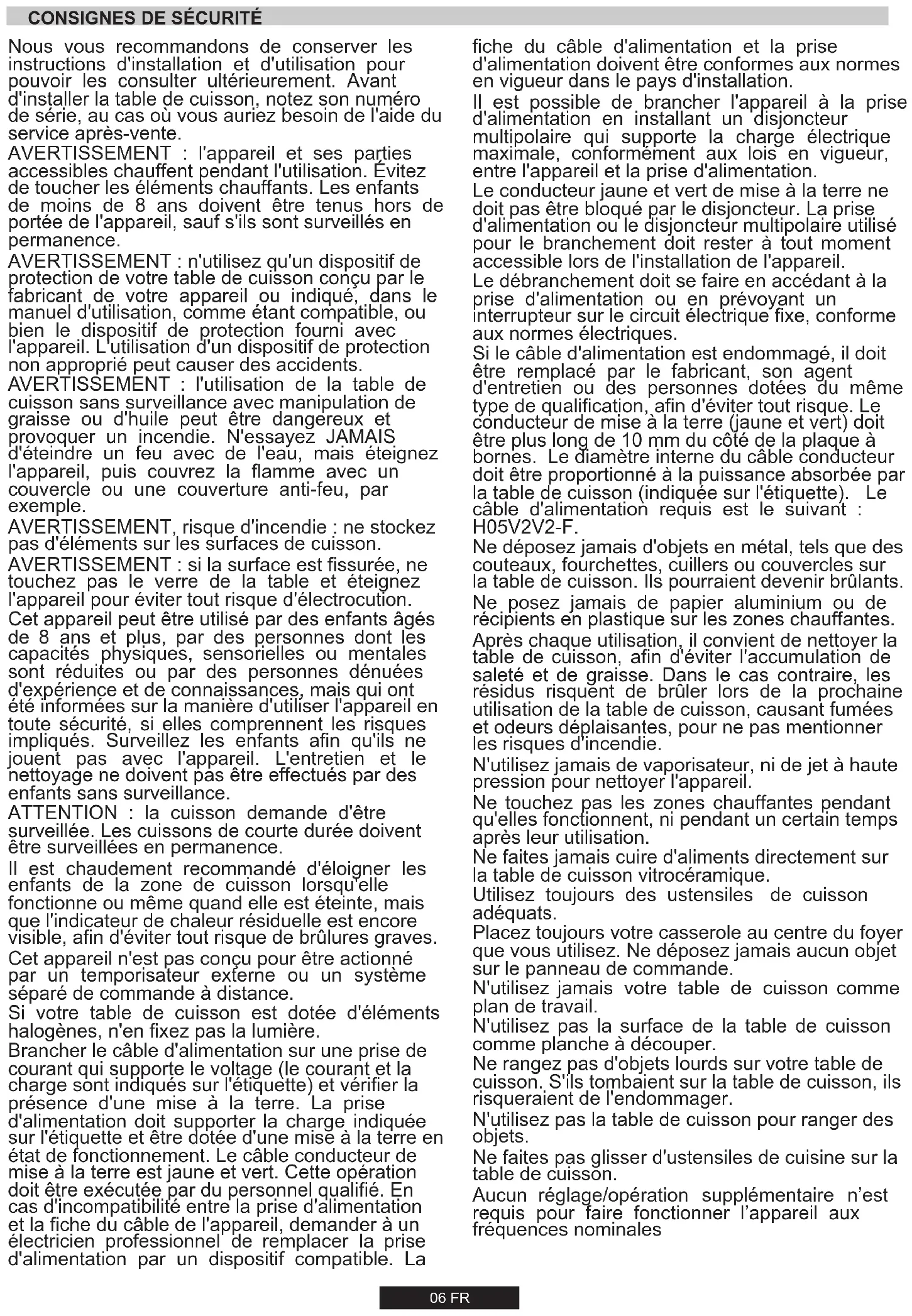 touchez pas le verre de la table et éteignez l'appareil pour éviter tout risque d'électrocution. Cet appareil peut être utilisé par des enfants âgés de 8 ans et plus, par des personnes dont les capacités physiques, sensorielles ou mentales sont réduites ou par des personnes dénuées d'expérience et de connaissances, mais qui ont été informées sur la manière d'utiliser l'appareil en toute sécurité, si elles comprennent les risques impliqués. Surveillez les enfants afin qu'ils ne jouent pas avec l'appareil. L'entretien et le nettoyage ne doivent pas être effectués par des enfants sans surveillance. ATTENTION : la cuisson demande d'être surveillée. Les cuissons de courte durée doivent être surveillées en permanence. Il est chaudement recommandé d'éloigner les enfants de la zone de cuisson lorsqu'elle fonctionne ou même quand elle est éteinte, mais que l'indicateur de chaleur résiduelle est encore visible, afin d'éviter tout risque de brûlures graves. Cet appareil n'est pas conçu pour être actionné par un temporisateur externe ou un système séparé de commande à distance. Si votre table de cuisson est dotée d'éléments halogènes, n'en fixez pas la lumière. Brancher le câble d'alimentation sur une prise de courant qui supporte le voltage (le courant et la charge sont indiqués sur l'étiquette) et vérifier la présence d'une mise à la terre. La prise d'alimentation doit supporter la charge indiquée sur l'étiquette et être dotée d'une mise à la terre en état de fonctionnement. Le câble conducteur de mise à la terre est jaune et vert. Cette opération doit être exécutée par du personnel qualifié. En cas d'incompatibilité entre la prise d'alimentation et la fiche du câble de l'appareil, demander à un électricien professionnel de remplacer la prise d'alimentation par un dispositif compatible. La
