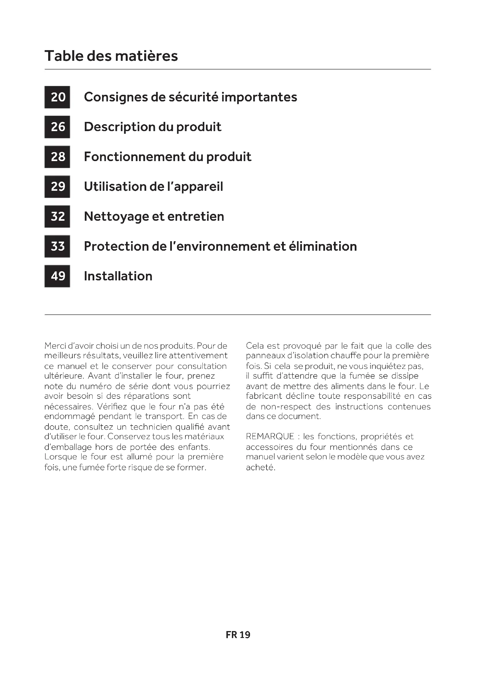 ed collection areas managed by the town council or a registered company. ln many countries, domestic collections may be available for large WEEEs. When you buy a new appliance, the old one can be returned to the vendor who must accept it free of charge as a one-o, as long as the appliance is of an equivalent type and has the same functions as the purchased appliance. PACKAGING RECOVERY (only for Cyprus) Environmental protection and disposalFR 19 Merci d’avoir choisi un de nos produits. Pour de meilleurs résultats, veuillez lire attentivement ce manuel et le conserver pour consultation ultérieure. Avant d’installer le four, prenez note du numéro de série dont vous pourriez avoir besoin si des réparations sont nécessaires. Vériez que le four n’a pas été endommagé pendant le transport. En cas de doute, consultez un technicien qualié avant d’utiliser le four. Conservez tous les matériaux d’emballage hors de portée des enfants. Lorsque le four est allumé pour la première fois, une fumée forte risque de se former. Cela est provoqué par le fait que la colle des panneaux d’isolation chaue pour la première fois. Si cela se produit, ne vous inquiétez pas, il sut d’attendre que la fumée se dissipe avant de mettre des aliments dans le four. Le fabricant décline toute responsabilité en cas de non-respect des instructions contenues dans ce document. REMARQUE : les fonctions, propriétés et accessoires du four mentionnés dans ce manuel varient selon le modèle que vous avez acheté. Consignes de sécurité importantes Description du produit Fonctionnement du produit Utilisation de l’appareil Nettoyage et entretien Protection de l’environnement et élimination Installation