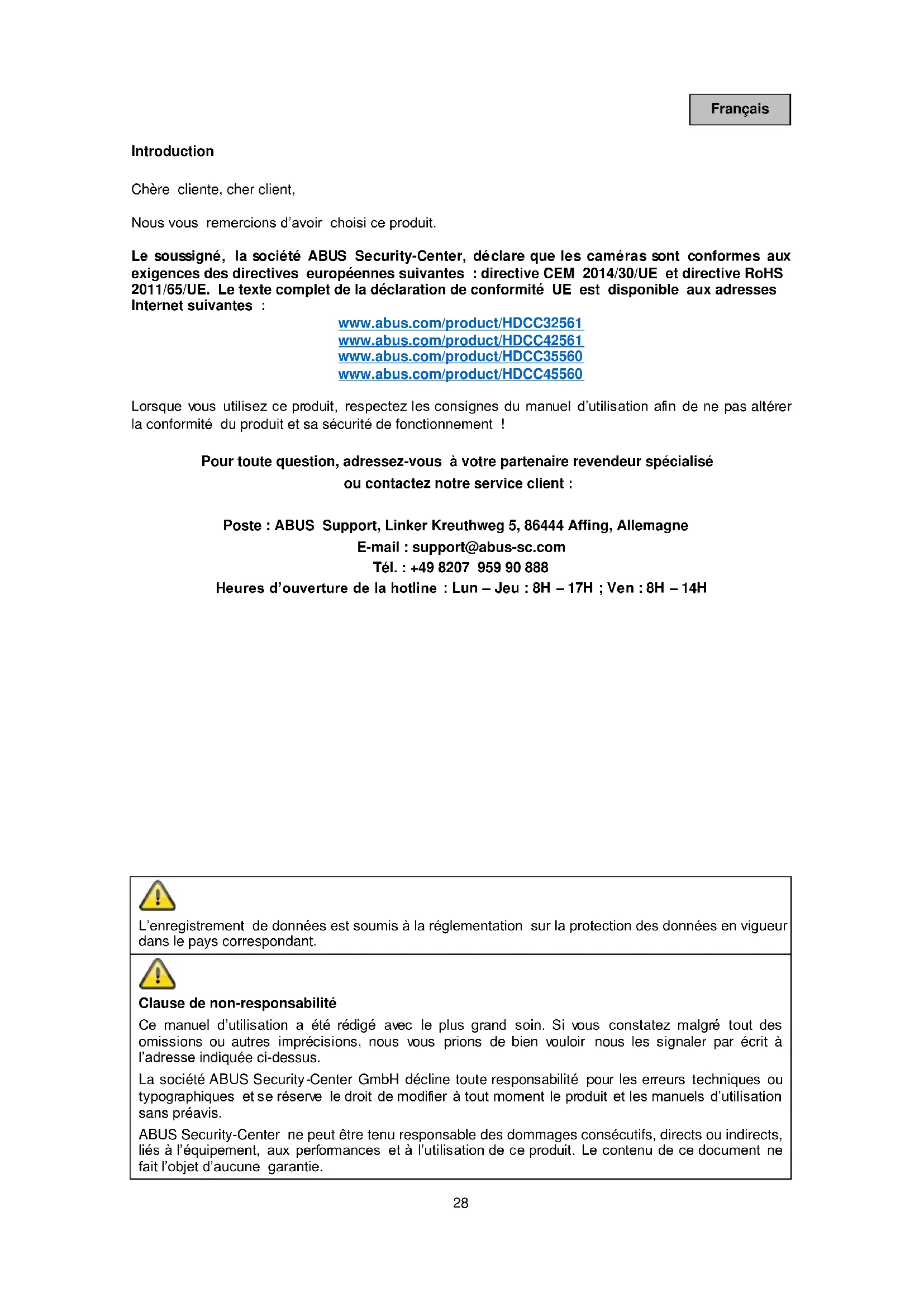 MAIN MENU (Menu principal) Guidage menu général BACK Un pas en arrière dans le menu EXIT Quitter le menu principal sans enregistrer les modifications EXIT & SAVE Quitter le menu principal et enregistrer toutes les modifications VIDEO FORMAT Sélectionner le format vidéo HDCC32561 / HDCC42561 : o 2MPx avec 25 ou 30 images par seconde HDCC35560 / HDCC45560 : o 2MPx avec 25 ou 30 images par seconde o 4MPx avec 25 ou 30 images par seconde o 5MPx avec 20 images par seconde39 Français EXPOSURE (Réglages d’exposition) EXPOSURE MODE Régler le mode d’exposition GLOBAL Automatique BLC Compensation de contre-jour HLC Compensation des surlignages WDR Wide Dynamic Range AGC Contrôle automatique du gain OFF Éteint LOW Faible MIDDLE Moyen HIGH Élevé SLOW Shutter Temps de pose OFF Temps de pose par défaut X2 – x16 Temps de pose élevé DAY NIGHT (Réglage jour/nuit) MODE Régler le mode AUTO Automatique COLOR Image toujours en couleur BW Image toujours en noir et blanc IR LIGHT Activer ou désactiver la lumière IR SMART IR Régler le mode SMART IR MODE 1 Pour l’intérieur et l’extérieur MODE 2 Pour l’intérieur MODE 3 Pour l’extérieur LEVEL Sélectionner le niveau IR D->N THRESHOLD Valeur seuil jour/nuit Plus la valeur est faible, plus tôt le mode jour/nuit changera Plus la valeur est élevée, plus tôt le mode jour/nuit changera N->D THRESHOLD Valeur seuil jour/nuit (voir plus haut)40 Français VIDEO SETTING (Réglages vidéo) IMAGE MODE Sélectionner le mode image STD Configuration par défaut HIGH-SAT Saturation élevée WHITE BALANCE Ouvrir les réglages de balance des blancs BRIGHTNESS Régler la luminosité CONTRAST Régler le contraste SHARPNESS Régler la netteté SATURATION Régler la saturation 3DNR Régler l’élimination dynamique des bruits parasites MIRROR Inverser l’image de la caméra DEFAULT Normal H Horizontal V Vertical HV Horizontal et vertical WB (Réglages de balance des blancs) MODE Régler le mode ATW Automatique MANUAL Réglage manuel RGAIN Régler l’augmentation du rouge BGAIN Régler l’augmentation du bleu FUNCTIONS (Réglages des fonctions) – Uniquement pour HDCC35560 / HDCC45560 MOTION DET Ouvrir la détection de mouvement PRIVACY Ouvrir le masquage des zones privées PRIVACY / MOTION (Masquage des zones privées / Détection de mouvement) MODE Activer/désactiver le masquage des zones privées/la détection de mouvement AREA x Éditer la zone DISPLAY Activer/désactiver les affichages X POSITION Régler la position des axes X Y POSITION Régler la position des axes Y WIDTH Régler la largeur HEIGHT Régler la hauteur RETURN Quitter le menu SENSITIVITY Régler la sensibilité COLOR Régler la couleur TRANSPARENCY Activer/désactiver la transparence RETURN Quitter le menu FACTORY DEFAULT Restaurer les réglages d’usine de la caméra41 Nederlands Inleiding Geachte klant, Hartelijk dank voor de aankoop van dit product. Hierbij verklaart ABUS Security-Center dat de camera's voldoen aan de volgende EU-richtlijnen: EMC-richtlijn 2014/30/EU en RoHS-richtlijn 2011/65/EU. De volledige tekst van de EU- conformiteitsverklaring is beschikbaar op de volgende website: www.abus.com/product/HDCC32561 www.abus.com/product/HDCC42561 www.abus.com/product/HDCC35560 www.abus.com/product/HDCC45560 Om deze toestand te behouden en een veilig gebruik te garanderen, dient u als gebruiker deze gebruikershandleiding in acht te nemen! Mocht u nog vragen hebben, neem dan contact op met uw speciaalzaak of neem contact op met onze klantenservice: Post: ABUS Support, Linker Kreuthweg 5, 86444 Affing, Duitsland E-mail: support@abus-sc.com Tel: +49 8207 959 90 888 Openingstijden hotline: Ma-do: 08 - 17 uur; vr: 08 – 14 uur