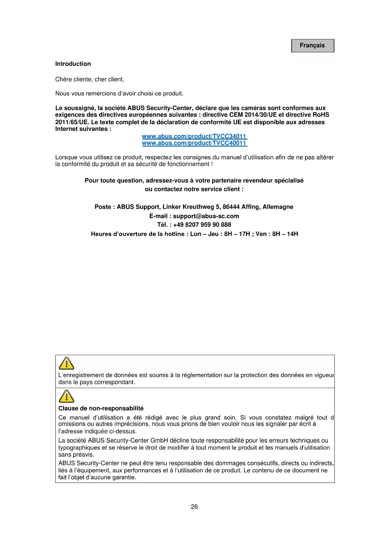 - RETURN Exit menu SENSITIVITY Set sensitivity COLOR Set colour TRANSPARENCY Enable/disable transparency RETURN Exit menu item FACTORY DEFAULT Reset camera to factory settings26 Français Introduction Chère cliente, cher client, Nous vous remercions d’avoir choisi ce produit. Le soussigné, la société ABUS Security-Center, déclare que les caméras sont conformes aux exigences des directives européennes suivantes : directive CEM 2014/30/UE et directive RoHS 2011/65/UE. Le texte complet de la déclaration de conformité UE est disponible aux adresses Internet suivantes : www.abus.com/product/TVCC34011 www.abus.com/product/TVCC40011 Lorsque vous utilisez ce produit, respectez les consignes du manuel d’utilisation afin de ne pas altérer la conformité du produit et sa sécurité de fonctionnement ! Pour toute question, adressez-vous à votre partenaire revendeur spécialisé ou contactez notre service client : Poste : ABUS Support, Linker Kreuthweg 5, 86444 Affing, Allemagne E-mail : support@abus-sc.com Tél. : +49 8207 959 90 888 Heures d’ouverture de la hotline : Lun – Jeu : 8H – 17H ; Ven : 8H – 14H