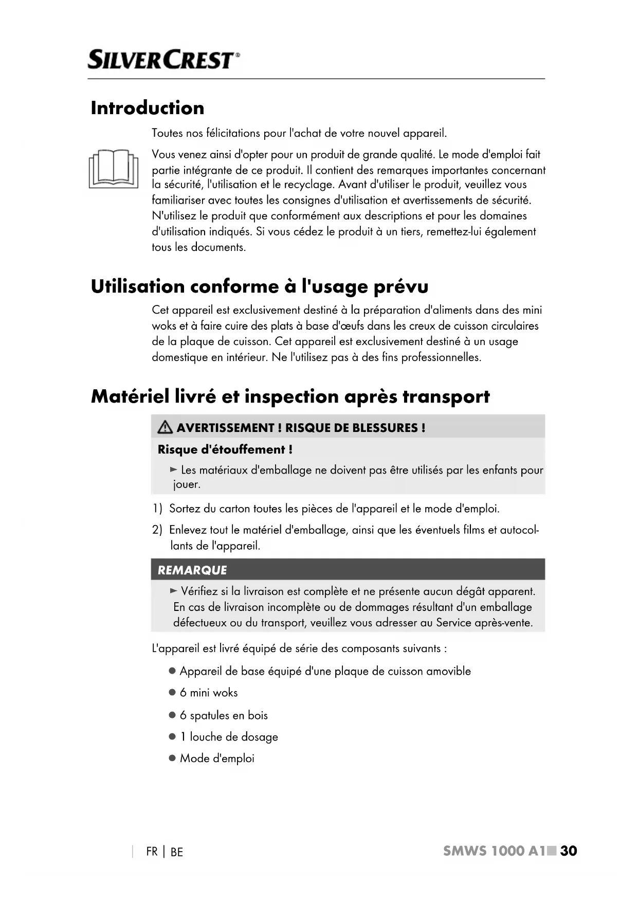 Introduction Toutes nos félicitations pour l'achat de votre nouvel appareil. Vous venez ainsi d'opter pour un produit de grande qualité. Le mode d'emploi fait partie intégrante de ce produit. Il contient des remarques importantes concernant la sécurité, l'utilisation et le recyclage. Avant d'utiliser le produit, veuillez vous familiariser avec toutes les consignes d'utilisation et avertissements de sécurité. N'utilisez le produit que conformément aux descriptions et pour les domaines d'utilisation indiqués. Si vous cédez le produit à un tiers, remettez-lui également tous les documents. Utilisation conforme à l'usage prévu Cet appareil est exclusivement destiné à la préparation d'aliments dans des mini woks et à faire cuire des plats à base d'œufs dans les creux de cuisson circulaires de la plaque de cuisson. Cet appareil est exclusivement destiné à un usage domestique en intérieur. Ne l'utilisez pas à des fins professionnelles. Matériel livré et inspection après transport AVERTISSEMENT! RISQUE DE BLESSURES! Risque d'étouffement! ► Les matériaux d'emballage ne doivent pas être utilisés par les enfants pour jouer.
