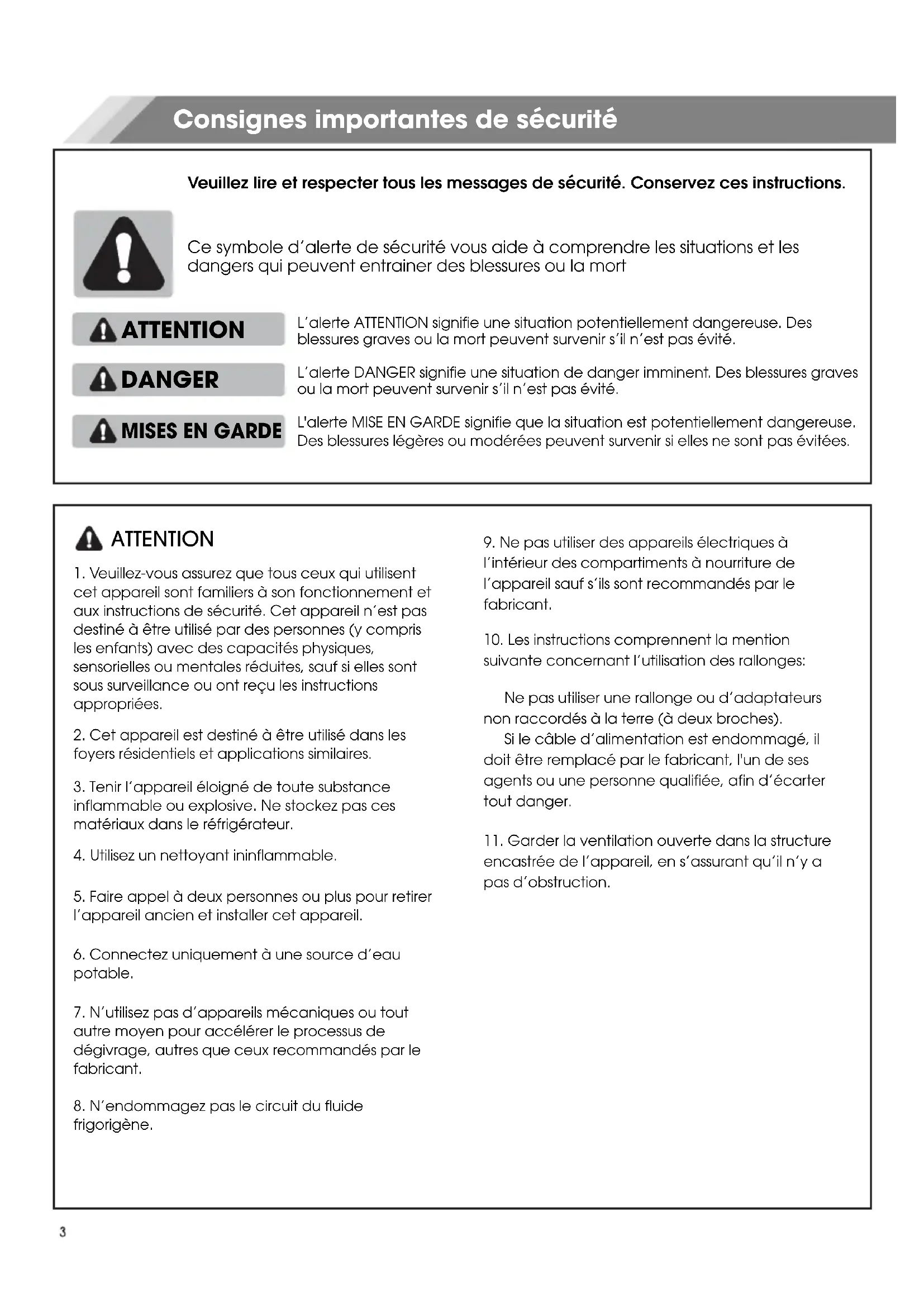 euillez lire et respecter tous les messages de sécurité. Conservez ces instructions. Ce symbole d’alerte de sécurité vous aide à comprendre les situations et les dangers qui peuvent entrainer des blessures ou la mort L’alerte ATTENTION signifie une situation potentiellement dangereuse. Des blessures graves ou la mort peuvent survenir s’il n’est pas évité. L’alerte DANGER signifie une situation de danger imminent . Des blessures graves ou la mort peuvent survenir s’il n’est pas évité. L'alerte MISE EN GARDE signifie que la situation est potentiellement dangereuse. Des blessures légères ou modérées peuvent survenir si elles ne sont pas évitées. ATTENTION