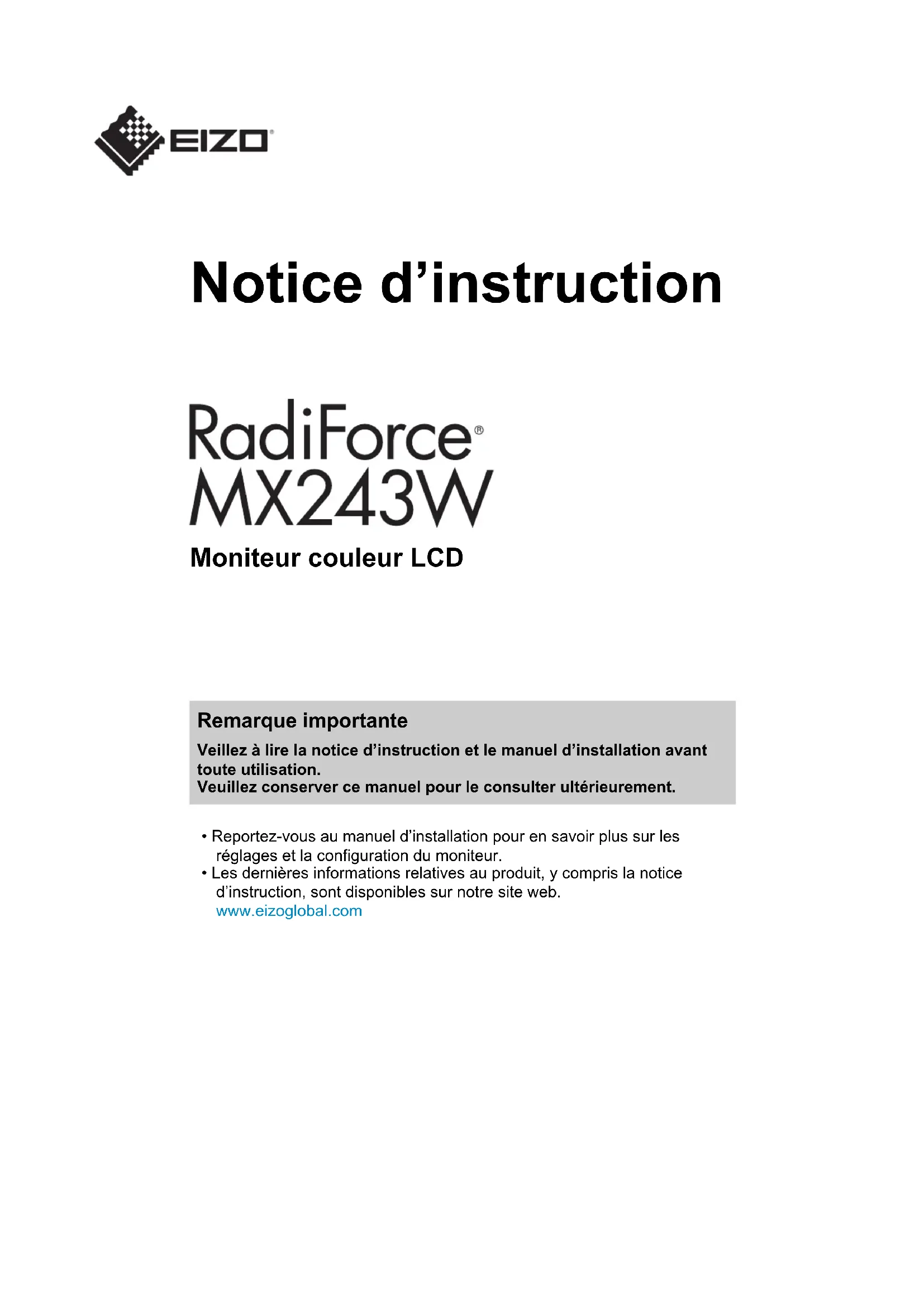 - Les dernières informations relatives au produit, y compris la notice d’instruction, sont disponibles sur notre site web. www.eizoglobal.com2