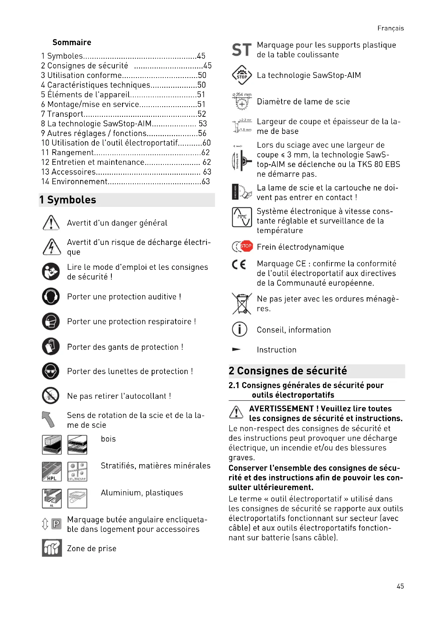 Largeur de coupe et épaisseur de la la me de base 3mm SawStop AIM Lors du sciage avec une largeur de coupe ≤ 3 mm, la technologie SawS top‑AIM se déclenche ou la TKS 80 EBS ne démarre pas. La lame de scie et la cartouche ne doi vent pas entrer en contact ! Système électronique à vitesse cons tante réglable et surveillance de la température STOP Frein électrodynamique Marquage CE : confirme la conformité de l'outil électroportatif aux directives de la Communauté européenne. Ne pas jeter avec les ordures ménagè res. Conseil, information Instruction 2 Consignes de sécurité