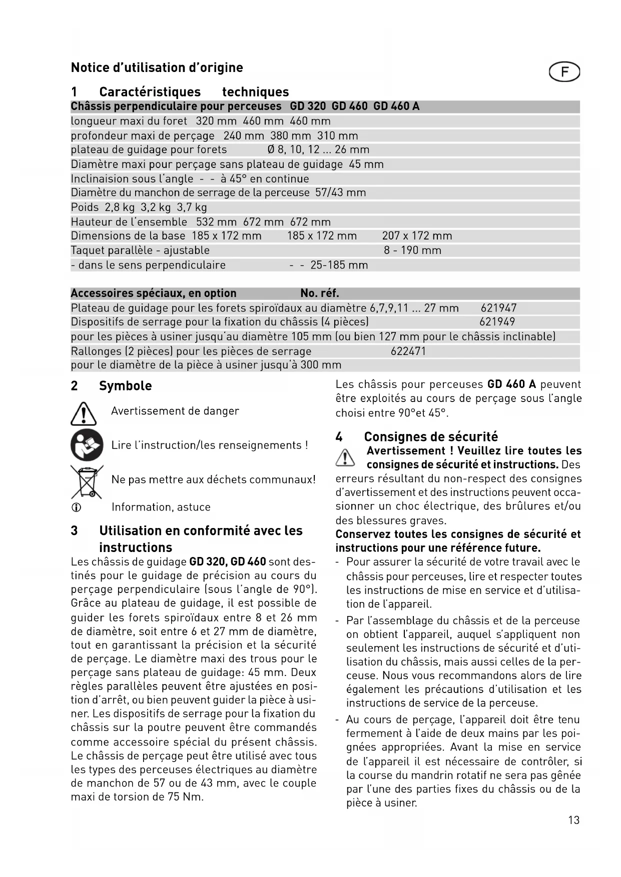 Use only original Festool spare parts! Order No. at: www.festool.com/Service - Maintain the clamping elements and the clamp- ing points free of dust, dirt and fi lings. - Using a rag, remove the dirt from the guide bars, and applying lubricating grease or ma- chine oil upon them, make sure they can slide easily. - Maintain the seating surfaces of the base board clean; in this way, you will guarantee the accu- racy and precision of the angles of the orifi ces. Respect the following rule: - The chosen springs of the drilling stand are at a larger distance from the guide bars intention- ally. This is no shortcoming; on the contrary, in this way, a better functioning of the springs is achieved. These springs allow for a lower re- sistance during the drilling 9 Environment Do not throw the power tool in your household waste! Dispose of the machine, accessories and packaging at an environmentally-responsible re- cycling centre! Observe the valid national regula- tions. Information on REACh: www.festool.com/reach13 Notice d’utilisation d’origine 1 Caractéristiques techniques Châssis perpendiculaire pour perceuses GD 320 GD 460 GD 460 A longueur maxi du foret 320 mm 460 mm 460 mm profondeur maxi de perçage 240 mm 380 mm 310 mm plateau de guidage pour forets Ø 8, 10, 12 ... 26 mm Diamètre maxi pour perçage sans plateau de guidage 45 mm Inclinaision sous l‘angle - - à 45° en continue Diamètre du manchon de serrage de la perceuse 57/43 mm Poids 2,8 kg 3,2 kg 3,7 kg Hauteur de l‘ensemble 532 mm 672 mm 672 mm Dimensions de la base 185 x 172 mm 185 x 172 mm 207 x 172 mm Taquet parallèle - ajustable 8 - 190 mm - dans le sens perpendiculaire - - 25-185 mm Accessoires spéciaux, en option No. réf. Plateau de guidage pour les forets spiroïdaux au diamètre 6,7,9,11 ... 27 mm 621947 Dispositifs de serrage pour la fi xation du châssis (4 pièces) 621949 pour les pièces à usiner jusqu‘au diamètre 105 mm (ou bien 127 mm pour le châssis inclinable) Rallonges (2 pièces) pour les pièces de serrage 622471 pour le diamètre de la pièce à usiner jusqu‘à 300 mm 2 Symbole Avertissement de danger Lire l’instruction/les renseignements ! Ne pas mettre aux déchets communaux! Information, astuce 3 Utilisation en conformité avec les instructions Les châssis de guidage GD 320, GD 460 sont des- tinés pour le guidage de précision au cours du perçage perpendiculaire (sous l’angle de 90°). Grâce au plateau de guidage, il est possible de guider les forets spiroïdaux entre 8 et 26 mm de diamètre, soit entre 6 et 27 mm de diamètre, tout en garantissant la précision et la sécurité de perçage. Le diamètre maxi des trous pour le perçage sans plateau de guidage: 45 mm. Deux règles parallèles peuvent être ajustées en posi- tion d’arrêt, ou bien peuvent guider la pièce à usi- ner. Les dispositifs de serrage pour la fi xation du châssis sur la poutre peuvent être commandés comme accessoire spécial du présent châssis. Le châssis de perçage peut être utilisé avec tous les types des perceuses électriques au diamètre de manchon de 57 ou de 43 mm, avec le couple maxi de torsion de 75 Nm. Les châssis pour perceuses GD 460 A peuvent être exploités au cours de perçage sous l’angle choisi entre 90°et 45°. 4 Consignes de sécurité Avertissement ! Veuillez lire toutes les consignes de sécurité et instructions. Des erreurs résultant du non-respect des consignes d’avertissement et des instructions peuvent occa- sionner un choc électrique, des brûlures et/ou des blessures graves. Conservez toutes les consignes de sécurité et instructions pour une référence future. - Pour assurer la sécurité de votre travail avec le châssis pour perceuses, lire et respecter toutes les instructions de mise en service et d’utilisa- tion de l’appareil. - Par l’assemblage du châssis et de la perceuse on obtient l’appareil, auquel s’appliquent non seulement les instructions de sécurité et d’uti- lisation du châssis, mais aussi celles de la per- ceuse. Nous vous recommandons alors de lire également les précautions d’utilisation et les instructions de service de la perceuse. - Au cours de perçage, l’appareil doit être tenu fermement à l’aide de deux mains par les poi- gnées appropriées. Avant la mise en service de l’appareil il est nécessaire de contrôler, si la course du mandrin rotatif ne sera pas gênée par l’une des parties fi xes du châssis ou de la pièce à usiner.14 - Avant de commencer les travaux il est néces- saire de contrôler et s’assurer, que tous les élé- ments destinés au serrage et à la limitation de la course, soient bien serrés à fond. - Les copeaux et autres éléments de ce genre ne doivent pas être évacués manuellement de la zone de travail au cours du perçage. - La rallonge avec la poignée supplémentaire doit être utilisée avec des perceuses possédant un couple supérieur à 55 Nm. - La pièce à usiner doit être toujours placée sur une surface rigide et elle doit être fermement serrée pour éviter son glissement ou sa rota- tion. - Les châssis pour perceuses inclinables (GD 460 A) doivent être fi xés, pour éviter leur mouve- ment au cours du perçage des trous inclinés. Nous recommandons d’utiliser les dispositifs de serrage (accessoires). Nous recommandons d’adopter une posture ferme et sûre au cours de votre travail sur l’appareil. - Au cours des travaux préparatifs de montage, installation, changement des forets, entretien et soins de l’appareil, il faut retirer la targette du câble d’alimentation de la perceuse de la prise de courant. 5 Eléments de l’appareil 1 Plateau de base 2 Règle parallèle 3 Plateau de guidage pour forets 4 Tige de guidage 5 Ressorts 6 Tube de butée 7 Butées de profondeur 8 Manchon de guidage 9 Réduction D 57/43 mm 10 Poignée supplémentaire 11 Rallonge de la poignée supplémentaire 12 Dispositifs de serrage 13 Rallonge 14 Vis d’ajustage de 