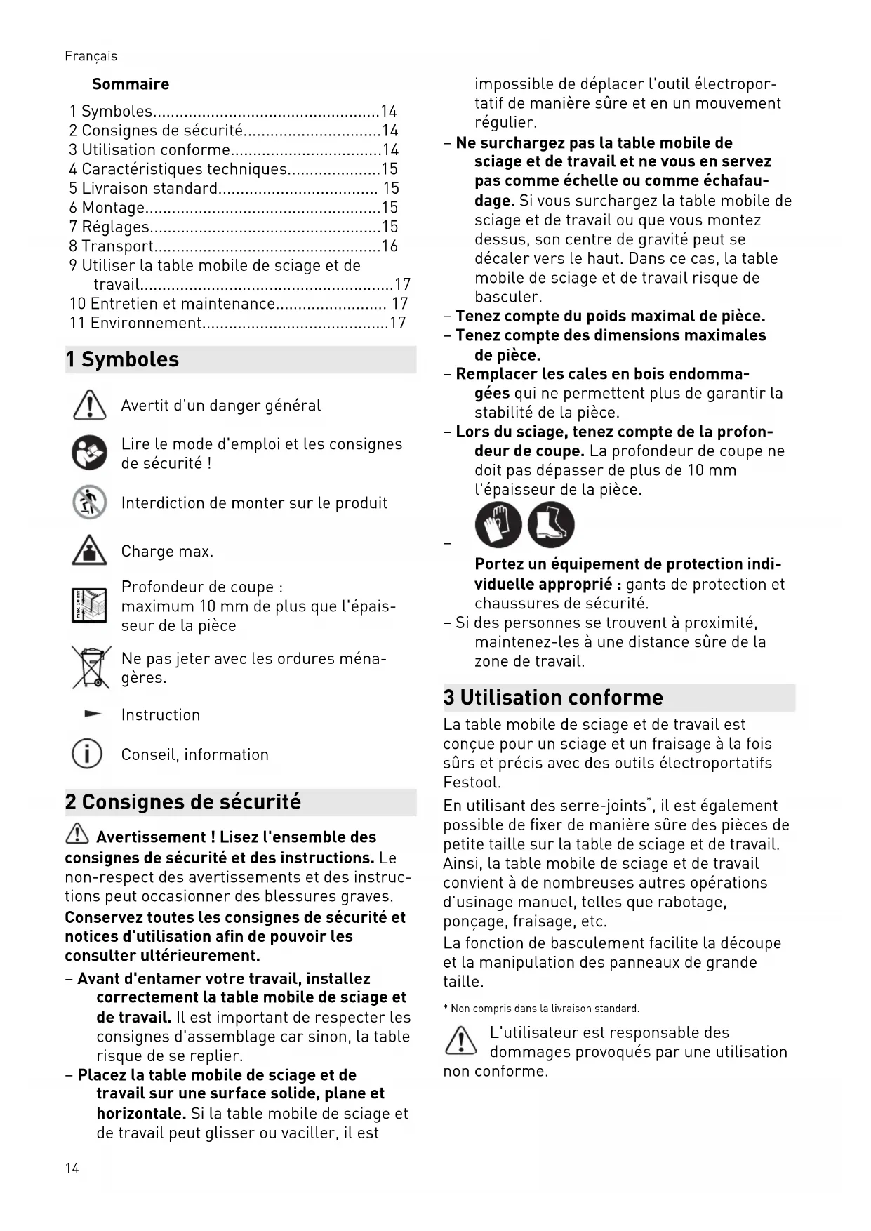 Portez un équipement de protection indi viduelle approprié : gants de protection et chaussures de sécurité. – Si des personnes se trouvent à proximité, maintenez-les à une distance sûre de la zone de travail. 3 Utilisation conforme La table mobile de sciage et de travail est conçue pour un sciage et un fraisage à la fois sûrs et précis avec des outils électroportatifs Festool. En utilisant des serre-joints