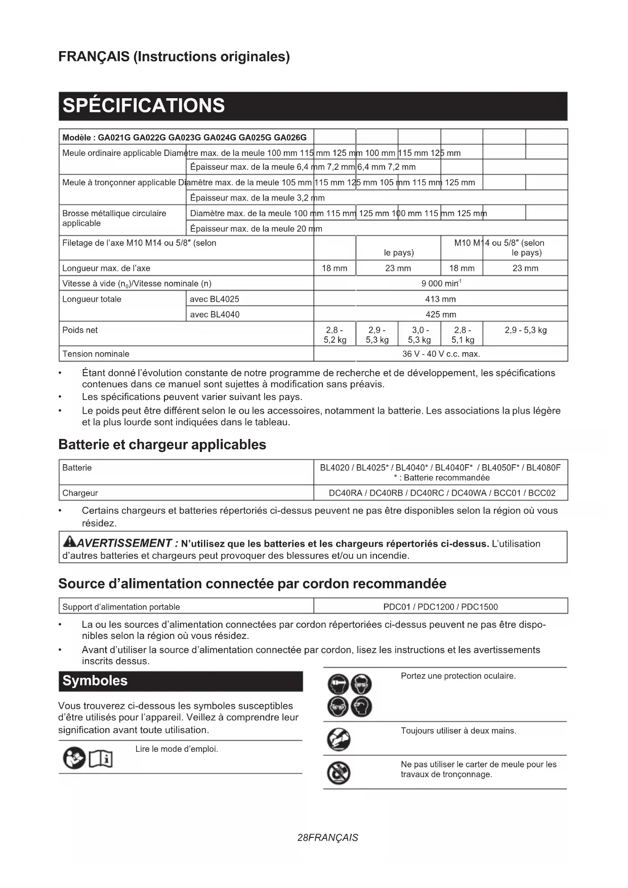 ) : (dB (A)) Incertitude (K) : (dB (A)) GA021G 84 92 3 GA022G 84 92 3 GA023G 84 92 3 GA024G 84 92 3 GA025G 84 92 3 GA026G 84 92 3 NOTE : La ou les valeurs d’émission de bruit déclarées ont été mesurées conformément à la méthode de test standard et peuvent être utilisées pour comparer les outils entre eux. NOTE : La ou les valeurs d’émission de bruit déclarées peuvent aussi être utilisées pour l’évaluation préliminaire de l’exposition.