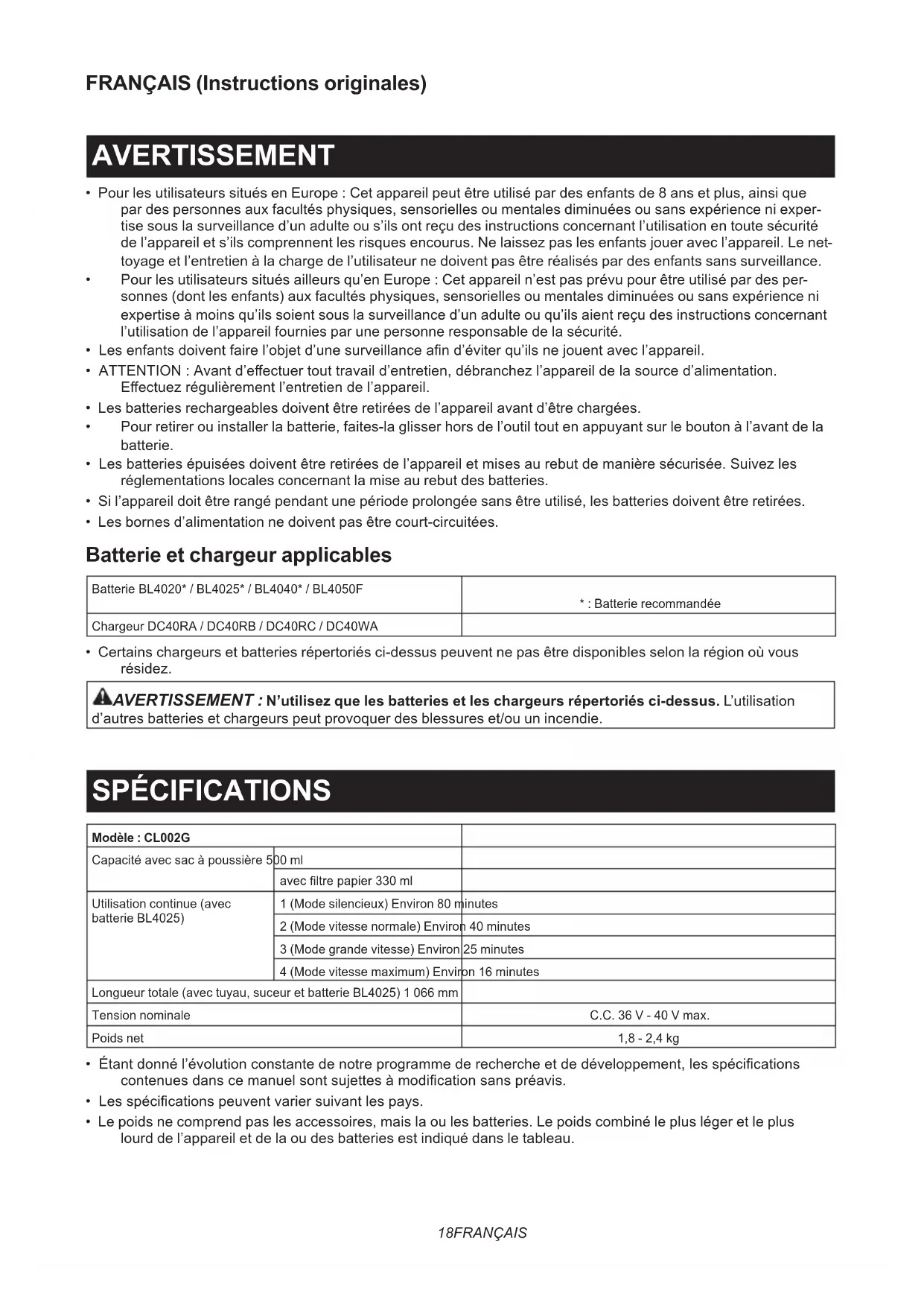 d’autres batteries et chargeurs peut provoquer des blessures et/ou un incendie. SPÉCIFICATIONS Modèle : CL002G Capacité avec sac à poussière 500 ml avec ltre papier 330 ml Utilisation continue (avec batterie BL4025) 1 (Mode silencieux) Environ 80 minutes 2 (Mode vitesse normale) Environ 40 minutes 3 (Mode grande vitesse) Environ 25 minutes 4 (Mode vitesse maximum) Environ 16 minutes Longueur totale (avec tuyau, suceur et batterie BL4025) 1 066 mm Tension nominale C.C. 36 V - 40 V max. Poids net 1,8 - 2,4 kg