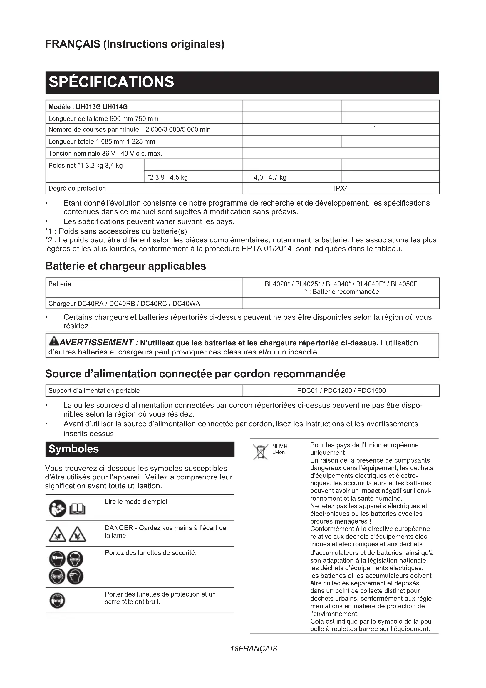 Longueur totale 1 085 mm 1 225 mm Tension nominale 36 V - 40 V c.c. max. Poids net *1 3,2 kg 3,4 kg *2 3,9 - 4,5 kg 4,0 - 4,7 kg Degré de protection IPX4