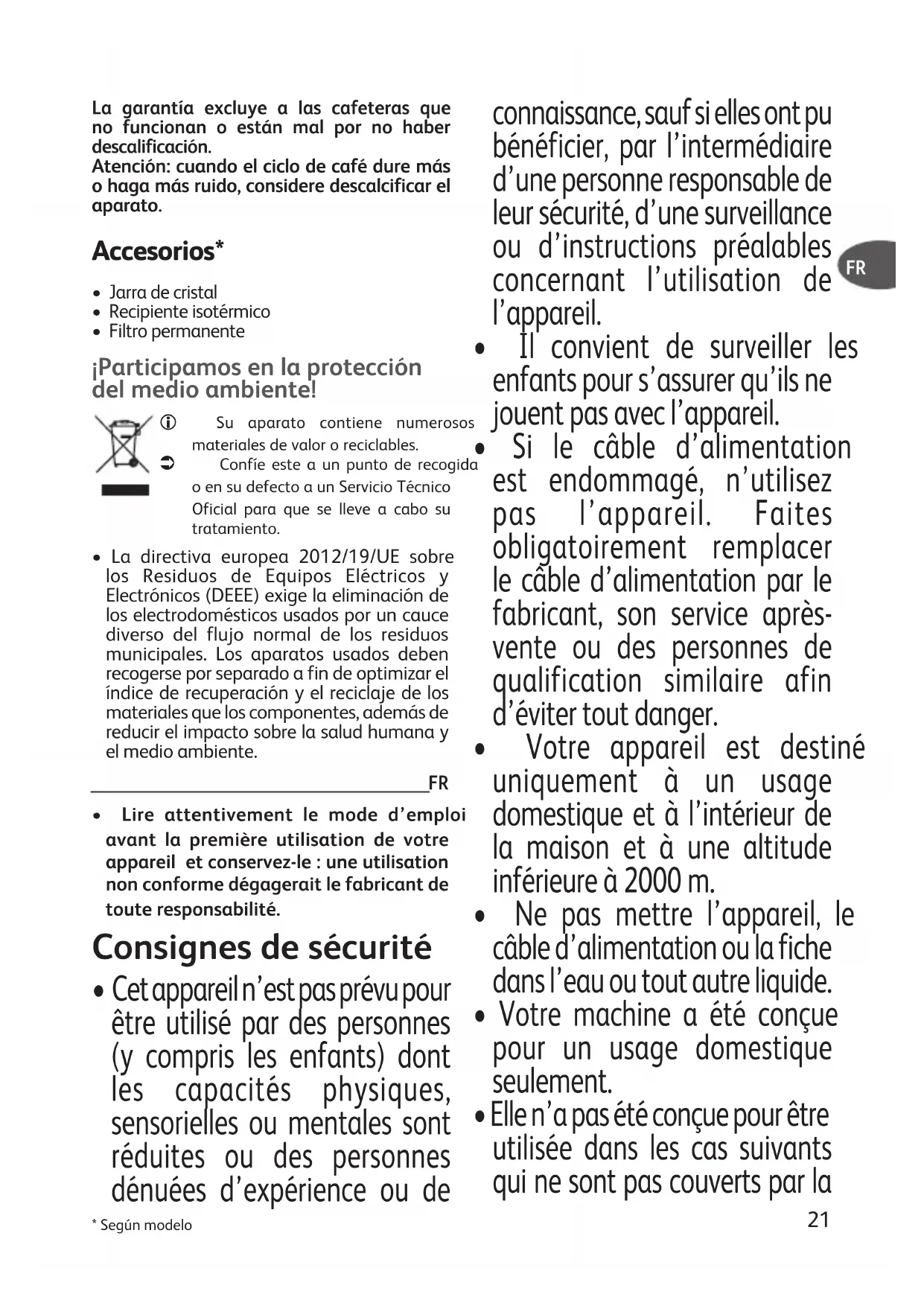 - Faire fonctionner la cafetière 2 ou 3 fois avec l’équivalent d’une verseuse d’eau pour la rincer. La garantie exclut les cafetières ne fonctionnant pas ou mal par absence de détartrage. Attention : dès que le cycle de café est plus long ou plus bruyant, pensez à faire un détartrage. Accessoires*