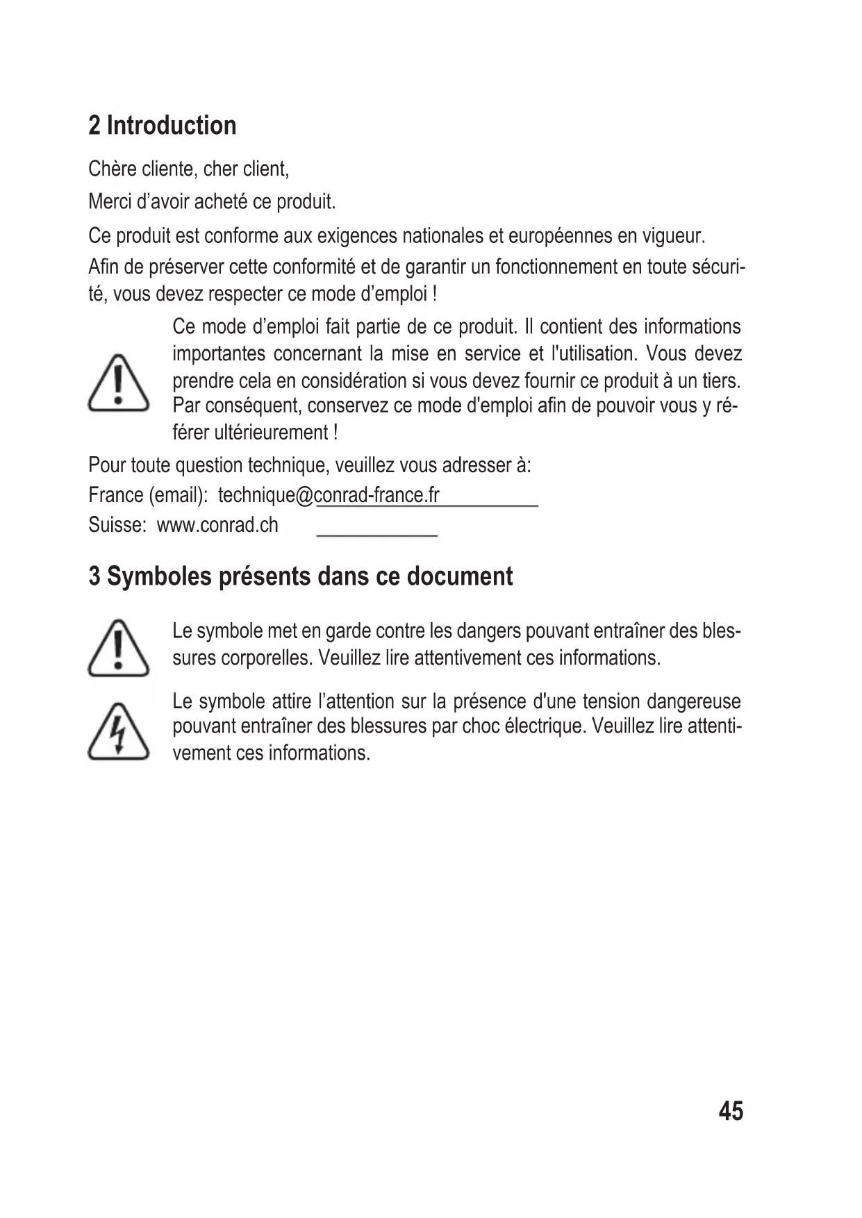 - 16.2 Bloc d'alimentation 442 Introduction Chère cliente, cher client, Merci d’avoir acheté ce produit. Ce produit est conforme aux exigences nationales et européennes en vigueur. An de préserver cette conformité et de garantir un fonctionnement en toute sécuri- té, vous devez respecter ce mode d’emploi ! Ce mode d’emploi fait partie de ce produit. Il contient des informations importantes concernant la mise en service et l'utilisation. Vous devez prendre cela en considération si vous devez fournir ce produit à un tiers. Par conséquent, conservez ce mode d'emploi an de pouvoir vous y ré- férer ultérieurement ! Pour toute question technique, veuillez vous adresser à: France (email): technique@conrad-france.fr Suisse: www.conrad.ch 3 Symboles présents dans ce document Le symbole met en garde contre les dangers pouvant entraîner des bles- sures corporelles. Veuillez lire attentivement ces informations. Le symbole attire l’attention sur la présence d'une tension dangereuse pouvant entraîner des blessures par choc électrique. Veuillez lire attenti- vement ces informations. 454 Utilisation prévue Le produit génère une image agrandie et est adapté à l'examen d'objets solides tels que les pièces de monnaie, les timbres, les pierres, les insectes, les plantes, les textiles, les cartes de circuits imprimés, etc. Le produit est destiné uniquement à une utilisation à l’intérieur. Ne l'utilisez pas à l’extérieur. Dans tous les cas, le contact avec l’humidité doit être évité. Toute utilisation à des ns autres que celles décrites pourrait endommager le pro- duit. Une mauvaise utilisation peut entraîner des risques tels que des courts-circuits, des incendies, des chocs électriques, etc. Ce produit est conforme aux exigences nationales et européennes en vigueur. Pour des raisons de sécurité et d’homologation, toute restructuration et/ou modication du produit est interdite. Lisez attentivement les instructions du mode d’emploi et conservez ce dernier dans un endroit sûr. Ne mettez ce produit à la disposition de tiers qu’avec son mode d’emploi. Tous les noms d’entreprises et appellations de produits sont des marques commer- ciales de leurs propriétaires respectifs. Tous droits réservés. 5 Contenu d'emballage p. 63