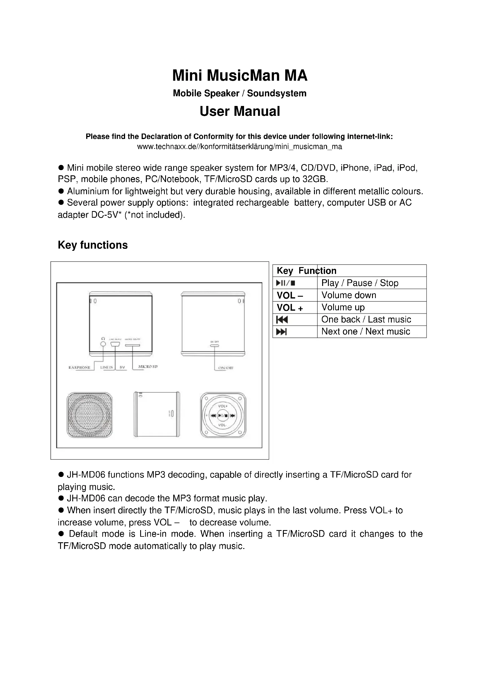 Mini MusicMan MA - Haut-parleur TECHNAXX - Notice d'utilisation et mode d'emploi gratuit
