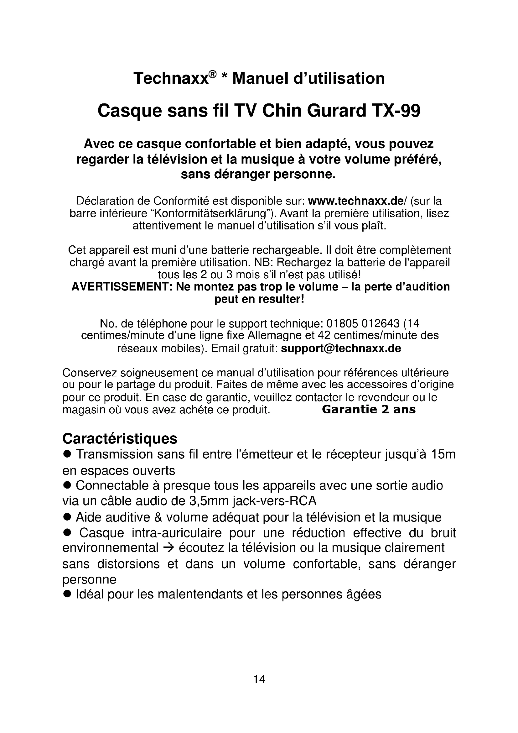 - Manuel d’utilisation Casque sans fil TV Chin Gurard TX-99 Avec ce casque confortable et bien adapté, vous pouvez regarder la télévision et la musique à votre volume préféré, sans déranger personne. Déclaration de Conformité est disponible sur: www.technaxx.de/ (sur la barre inférieure “Konformitätserklärung”). Avant la première utilisation, lisez attentivement le manuel d’utilisation s’il vous plaît. Cet appareil est muni d’une batterie rechargeable. Il doit être complètement chargé avant la première utilisation. NB: Rechargez la batterie de l'appareil tous les 2 ou 3 mois s'il n'est pas utilisé!