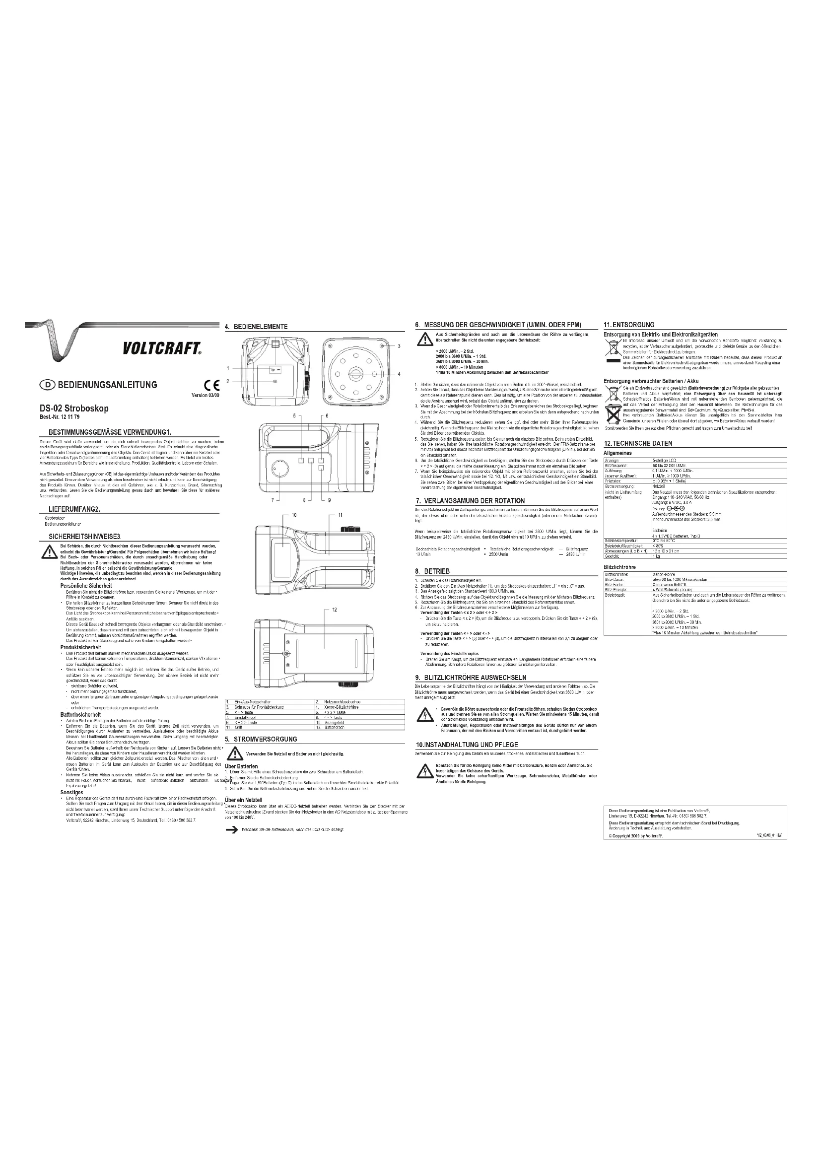 1RPM≥1000RPM Accuracy: ± (0.05% + 1 digit) Power supply: (not included in delivery) Power adapter: Thepoweradaptermustmatchthefollowingtechnicalspecication: Input: 110~240 V/AC, 50/60 Hz Output: 9 V/DC, 3.0 A Polarity: Outer diameter of plug: 5.5 mm Inner diameter of plug: 2.5 mm Batteries: 4 x 1.5V/DC batteries, size D Operating temperature: 0 ºC to 50 ºC Operating humidity: < 80% Dimensions ( L x W x H): 12 x 12 x 21 cm Weight: 1 kg Flash tube Flash tube: Xenon tube Flash duration: Approx. 60 to 1000 microseconds Flash colour: Xenon white 6500 K degree Flash energy: 4 watt/second (joules) Operating time: For safety reasons and also to extend the service life of the tube, do not exceed the operating time as stated below: < 2000 RPM – 2 hrs 2000 to 3600 RPM – 1 hr 3601 to 8000 RPM – 30 minutes > 8000 RPM – 10 minutes *with 10 minutes of cooling down in between sessions*MODE D`EMPLOI Version 03/09 DS-02 STROBOSCOPE Nº de commande 12 11 79 UTILISATION PRÉVUE1. Cet appareil est utilisé pour contrôler un objet en mouvement rapide en lui donnant l’apparence d’un objet en mouvement ralenti ou stationnaire. Il permet d’effectuer un contrôle de diagnostic ou de mesurer la vitesse de l’objet. Cet appareil manuel peut être alimenté par un adaptateur secteur ou par 4 piles de taille D (les deux ne sont pas fournis avec l’appareil). Ce produit est utilisable dans de nombreux domaines d’application tels que la maintenance, la production, le contrôle qualité, les laboratoires ou à l’école. Laconversionet/oulamodicationnonautoriséesdel’appareilnesontpaspermisespourdesraisonsde sécurité et d’approbation (CE). Tout usage autre que celui décrit ci-dessus est interdit, peut endommager le produit et poser des risques tels que courts-circuits, incendies, chocs électriques, etc. Prière de lire attentivement le mode d’emploi et de le conserver à titre de référence. CONTENU D’EMBALLAGE2. Stroboscope• Mode d’emploi• CONSIGNES DE SÉCURITÉ3. Nous déclinons toute responsabilité en cas de dommages matériels ou de blessures dans le cas où cet appareil aurait été maltraité de quelque façon que ce soit ou endommagé du fait d’une mauvaise utilisation ou d’un non respect de ce mode d’emploi. La garantie en serait d’ailleurs annulée! Le point d’exclamation attire l’attention sur une information importante dont il convient de tenir compte impérativement. Sécurité des personnes Ne pas toucher le tube à éclairs et ne pas utiliser d’outils pouvant entrer en contact avec le • tube. Lesashslumineuxpeuventprovoquerdesproblèmesdevisionpassagers.Nepasregarder• directementdanslestroboscopeouleréecteur. Les ashs du stroboscope peuvent entraîner des crises chez les personnes souffrant• d’épilepsie photosensible. Cet instrument donne aux objets en mouvement rapide l’apparence d’objets en mouvement • ralenti ou stationnaire. Assurez-vous que personne n’entre en contact avec l’objet en mouvement rapide qui est examiné. Ce produit n’est pas un jouet et doit être tenu hors de portée des enfants!• Sécurité du produit Ne soumettez pas ce produit à de fortes contraintes mécaniques.• Ce produit ne doit pas être exposé à des températures extrêmes, aux rayons directs du soleil • ou à d’intenses vibrations. Il faut considérer que l’appareil ne peut plus fonctionner sans danger lorsqu’il : • présente des dommages visibles, - ne marche plus, - a été entreposé pendant une longue durée dans des conditions non appropriées ou - présente de fortes sollicitations de transport. - Sécurité des piles Attention à bien respecter la polarité lors de la mise en place des piles. (« + » = positif « – » • = négatif). Retirerlespilesdel’appareillorsquecederniern’estpasutilisépendantunelongueduréean• d’éviter tout endommagement dû à des fuites. Des fuites ou des piles endommagées peuvent provoquer des brûlures acides lors d’un contact avec la peau, il convient donc d’utiliser des gants de protection appropriés pour manipuler des piles usagées. Maintenirlespileshorsdeportéedesenfants.Nepaslaisserdepiletraîner,unenfantouun• animal domestique pourrait en avaler une. Remplacer toutes les piles en même temps. Mélanger des piles neuves et des piles usagées • dans l’appareil peut provoquer des fuites et un endommagement de l’appareil. Ne pas démonter, court-circuiter ou jeter des piles dans le feu. Ne jamais recharger des piles • non rechargeables. Un risque d’explosion existe ! Divers La réparations ou de réglages ne peuvent être effectués que par un spécialiste ou un atelier • spécialisé. L´appareil de mesure pour lesquelles vous ne trouvez pas de réponses dans le présent • mode d’emploi, nos support technique se tient volontiers à votre disposition à l´adresse et au numéro de téléphone suivants: Voltcraft