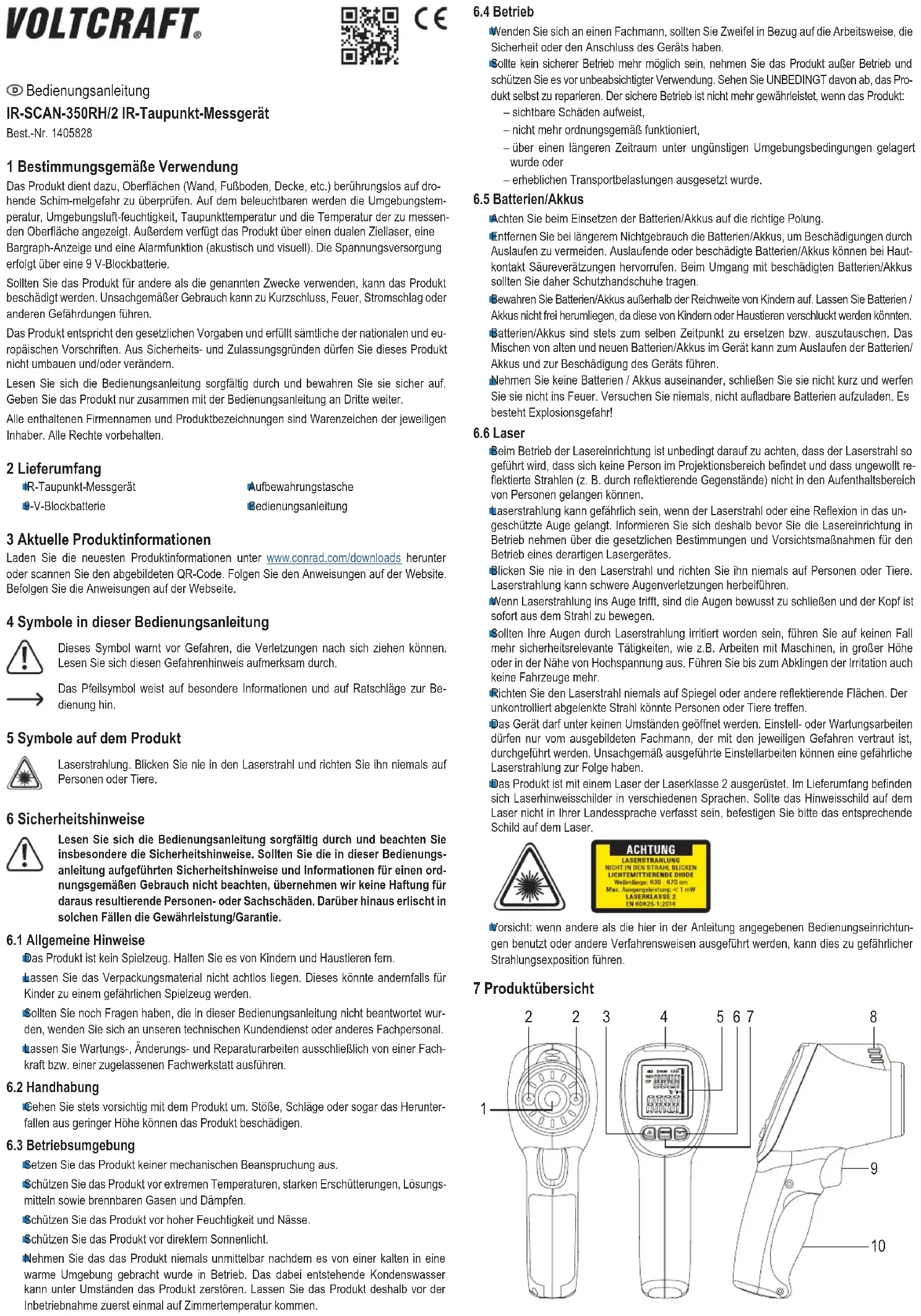 Mode d’emploi 3 Dernières informations sur le produit Téléchargez les dernières informations sur les produits à l’adresse www.conrad.com/downloads ou scannez le code QR. Suivez les instructions gurant sur le site Web. 4 Symboles présents dans ce document Le symbole met en garde contre les dangers pouvant entraîner des blessures cor- porelles. Veuillez lire attentivement ces informations. Le symbole de la èche indique des informations spéciques et des conseils spé- ciaux pour le fonctionnement. 5 Symboles sur le produit Rayonnement laser. Ne regardez jamais directement dans le faisceau laser et ne le pointez jamais vers des personnes ou des animaux. 6 Consignes de sécurité Lisez attentivement le mode d’emploi et respectez en particulier les consignes de sécurité. Nous déclinons toute responsabilité en cas de dommages corpo- rels ou matériels résultant du non-respect des consignes de sécurité et des informations relatives à la manipulation correcte contenues dans ce manuel. De tels cas entraînent l’annulation de la garantie.