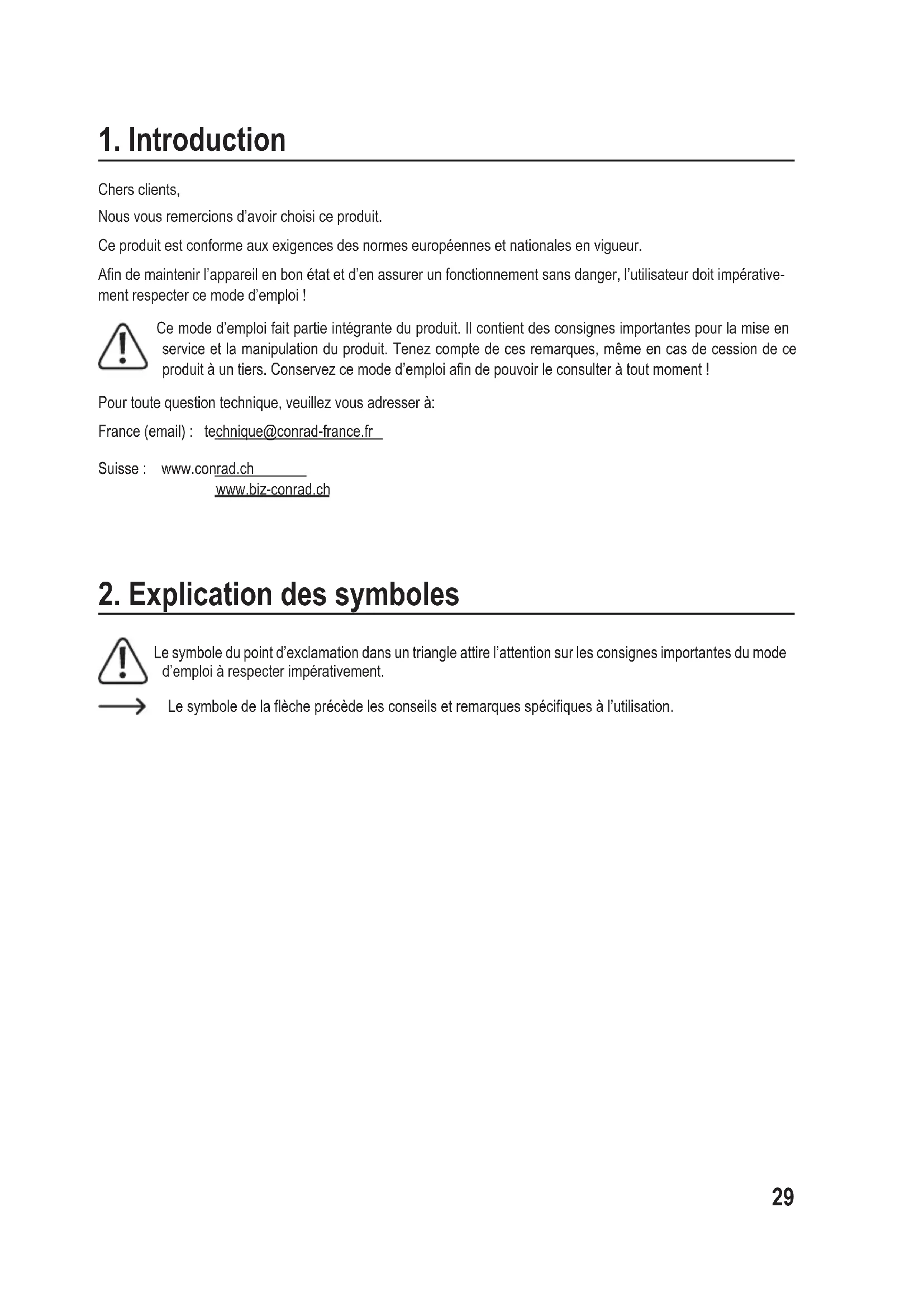 Chers clients, Nousvousremercionsd’avoirchoisiceproduit. Ce produit est conforme aux exigences des normes européennes et nationales en vigueur. Andemaintenirl’appareilenbonétatetd’enassurerunfonctionnementsansdanger,l’utilisateurdoitimpérative- ment respecter ce mode d’emploi ! Ce mode d’emploi fait partie intégrante du produit. Il contient des consignes importantes pour la mise en service et la manipulation du produit. Tenez compte de ces remarques, même en cas de cession de ce produitàuntiers.Conservezcemoded’emploiandepouvoirleconsulteràtoutmoment! Pour toute question technique, veuillez vous adresser à: France (email) : technique@conrad-france.fr Suisse : www.conrad.ch www.biz-conrad.ch