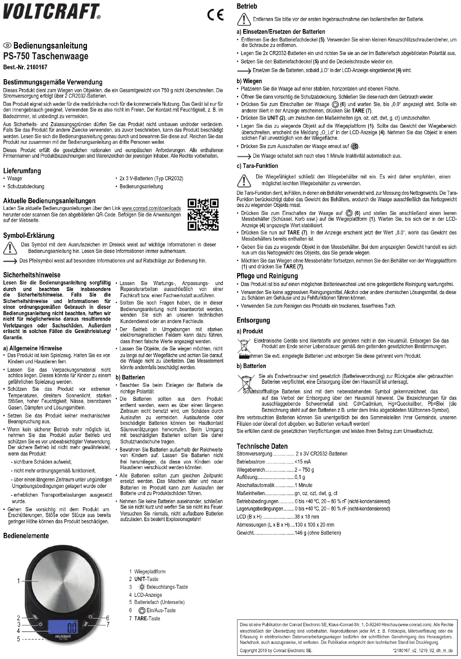 - N’utilisez pas de produits de nettoyage abrasifs, d’alcool à frictionner ou autre produit chimique : ceux-ci risqueraient d’abîmer le boîtier et de causer des dysfonctionnements.• Nettoyez le produit avec un chiffon sec et sans fibres. Élimination des déchets a) Produit Les appareils électroniques sont des matériaux recyclables et ne doivent pas être éliminés avec les ordures ménagères. En fin de vie, éliminez l’appareil conformément aux dispositions légales en vigueur. Retirez les accumulateurs insérées et éliminez-les séparément du produit. b) Piles Le consommateur final est légalement tenu (ordonnance relative à l´élimination des piles usagées) de rapporter toutes les piles usagées, il est interdit de les jeter dans les ordures ménagères. Les piles contenant des substances toxiques sont marquées par le symbole ci-contre, qui signifie qu’elles ne doivent pas être jetées avec les ordures ménagères. Les désignations pour le métal lourd prépondérant sont : Cd = cadmium, Hg = mercure, Pb = plomb (la désignation se trouve sur les accumulateurs, par ex. sous le symbole de la poubelle illustré à gauche).Vous pouvez rapporter gratuitement vos piles usagées aux centres de récupération de votre commune, à nos succursales ou à tous les points de vente de piles.Ainsi, vous respectez les ordonnances légales et contribuez à la protection de l’environnement. Données techniques Alimentation électrique ........2 piles de 3 V (de type CR2032)Courant de fonctionnement ...<15 mACapacité de pesage .............2 à 750 gRésolution ............................0,1 gArrêt automatique ................1 minuteUnités de mesure ................gn, oz, ozt, dwt, g, ct Conditions d’utilisation ......... 0 à +40 °C, 20 à 80 % d’humidité relative (sans condensation) Conditions de stockage ....... 0 à +40 °C, 20 à 80 % d’humidité relative (sans condensation)LCD (L x H) ..........................38 x 18 mmDimensions (L x l x H)..........130 x 100 x 20 mmPoids ....................................146 g (sans piles) Mode d’emploi PS-750 Balance de Poche N° de commande 2180167 Utilisation prévue Ce produit est conçu pour peser des objets d’un poids maximal de 750 g. L’alimentation électrique est fournie via 2 piles de type CR2032.Le produit n’est pas destiné à un usage médical ou commercial. Ce produit est prévu pour un usage à l’intérieur exclusivement. Ne l'utilisez pas à l’extérieur. Tout contact avec l’humidité, par ex. dans les salles de bains, doit être évité en toutes circonstances.Pour des raisons de sécurité et d’homologation, toute restructuration et/ou modification du produit est interdite. Le produit pourrait être endommagé en cas d’utilisation autre que celle décrite ci-dessus. Lisez attentivement les instructions du mode d’emploi et conservez-le dans un endroit sûr. Ne mettez ce produit à la disposition de tiers qu’avec son mode d’emploi.Ce produit est conforme aux exigences nationales et européennes en vigueur. Tous les noms d’entreprises et appellations de produits sont des marques commerciales de leurs propriétaires respectifs. Tous droits réservés. Contenu d’emballage