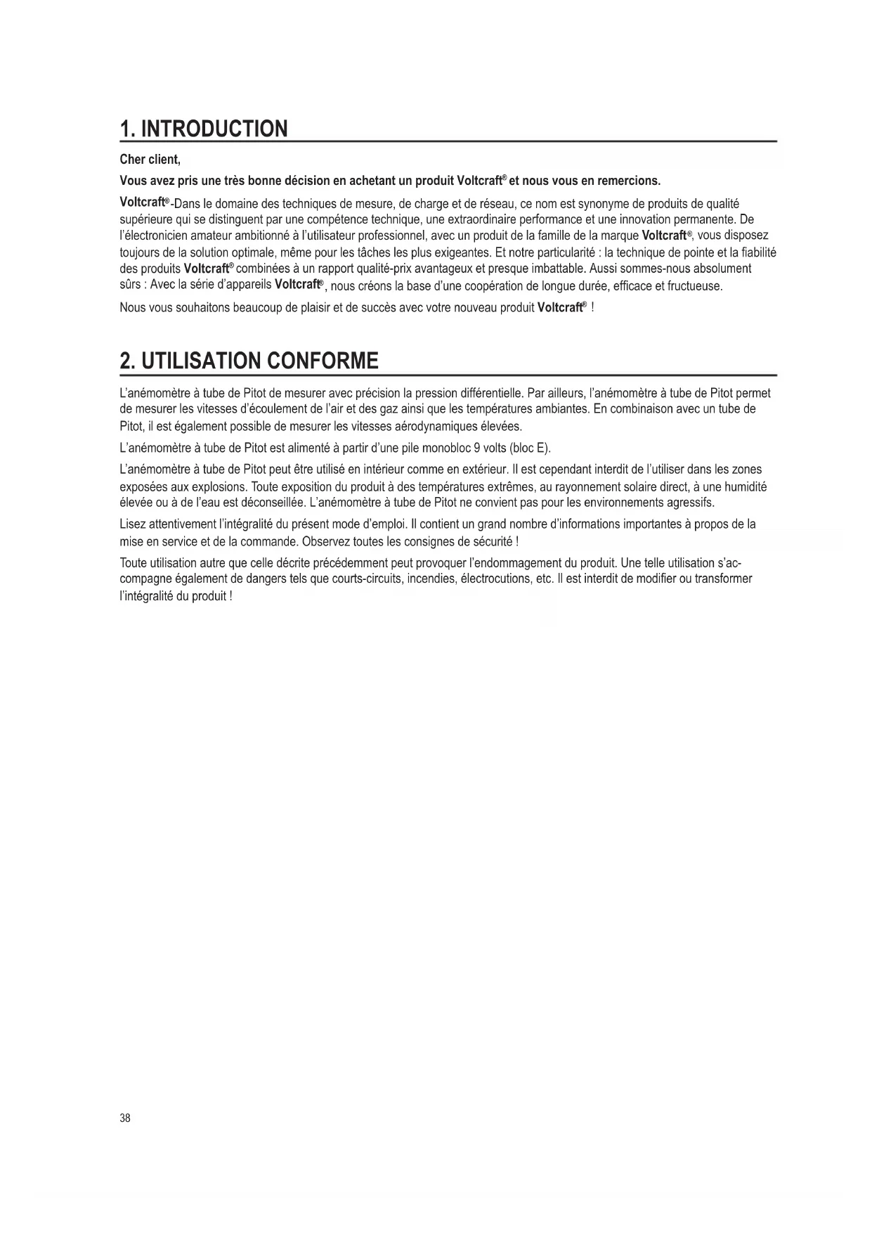 L’anémomètre à tube de Pitot de mesurer avec précision la pression différentielle. Par ailleurs, l’anémomètre à tube de Pitot permet de mesurer les vitesses d’écoulement de l’air et des gaz ainsi que les températures ambiantes. En combinaison avec un tube de Pitot, il est également possible de mesurer les vitesses aérodynamiques élevées. L’anémomètre à tube de Pitot est alimenté à partir d’une pile monobloc 9 volts (bloc E). L’anémomètre à tube de Pitot peut être utilisé en intérieur comme en extérieur. Il est cependant interdit de l’utiliser dans les zones exposées aux explosions. Toute exposition du produit à des températures extrêmes, au rayonnement solaire direct, à une humidité élevée ou à de l’eau est déconseillée. L’anémomètre à tube de Pitot ne convient pas pour les environnements agressifs. Lisez attentivement l’intégralité du présent mode d’emploi. Il contient un grand nombre d’informations importantes à propos de la mise en service et de la commande. Observez toutes les consignes de sécurité ! Toute utilisation autre que celle décrite précédemment peut provoquer l’endommagement du produit. Une telle utilisation s’ac- compagne également de dangers tels que courts-circuits, incendies, électrocutions, etc. Il est interdit de modier ou transformer l’intégralité du produit !39