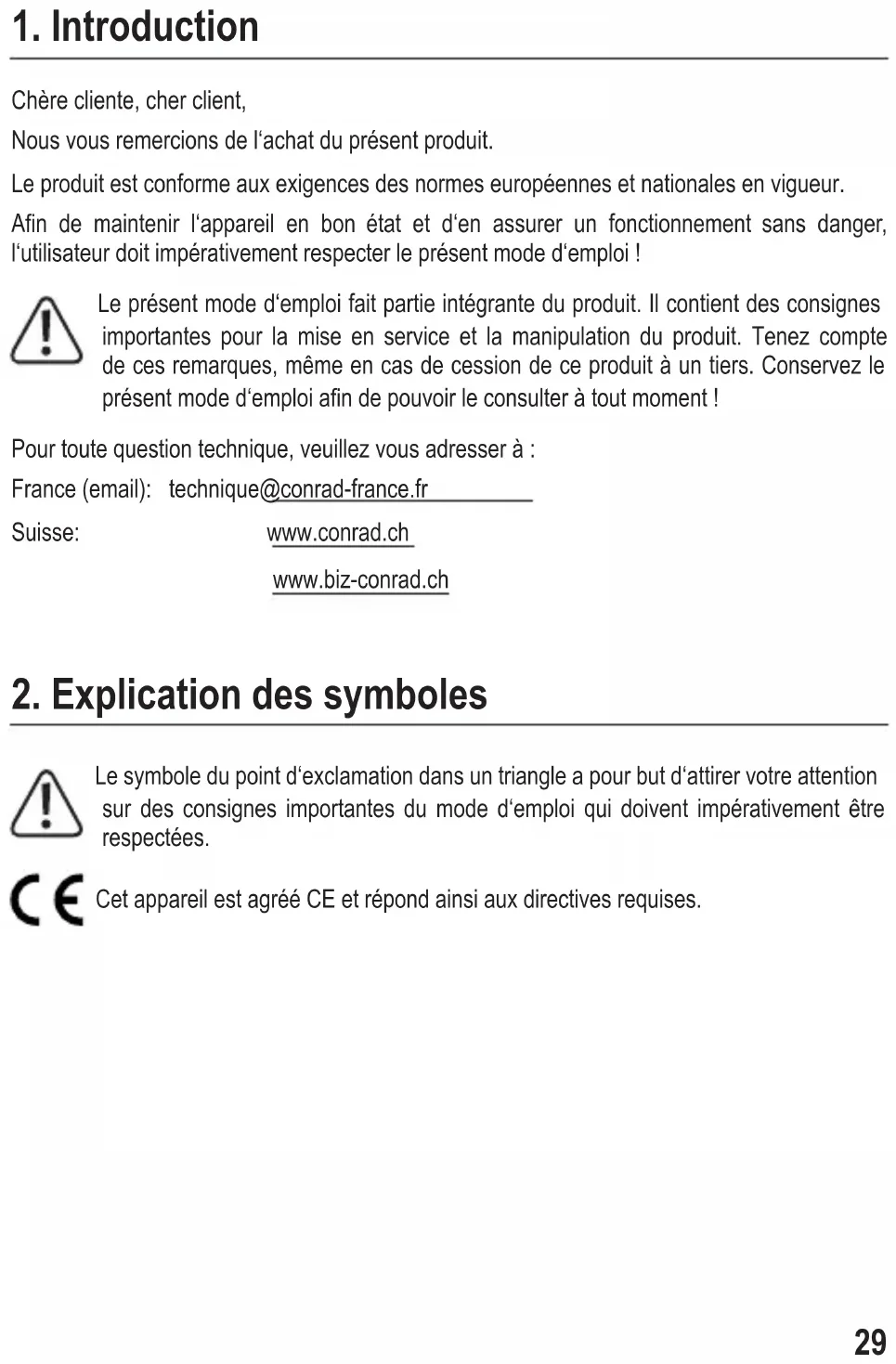 Chère cliente, cher client, Nous vous remercions de l‘achat du présent produit. Le produit est conforme aux exigences des normes européennes et nationales en vigueur. An de maintenir l‘appareil en bon état et d‘en assurer un fonctionnement sans danger, l‘utilisateur doit impérativement respecter le présent mode d‘emploi ! Le présent mode d‘emploi fait partie intégrante du produit. Il contient des consignes importantes pour la mise en service et la manipulation du produit. Tenez compte de ces remarques, même en cas de cession de ce produit à un tiers. Conservez le présent mode d‘emploi an de pouvoir le consulter à tout moment ! Pour toute question technique, veuillez vous adresser à : France (email): technique@conrad-france.fr Suisse: www.conrad.ch www.biz-conrad.ch
