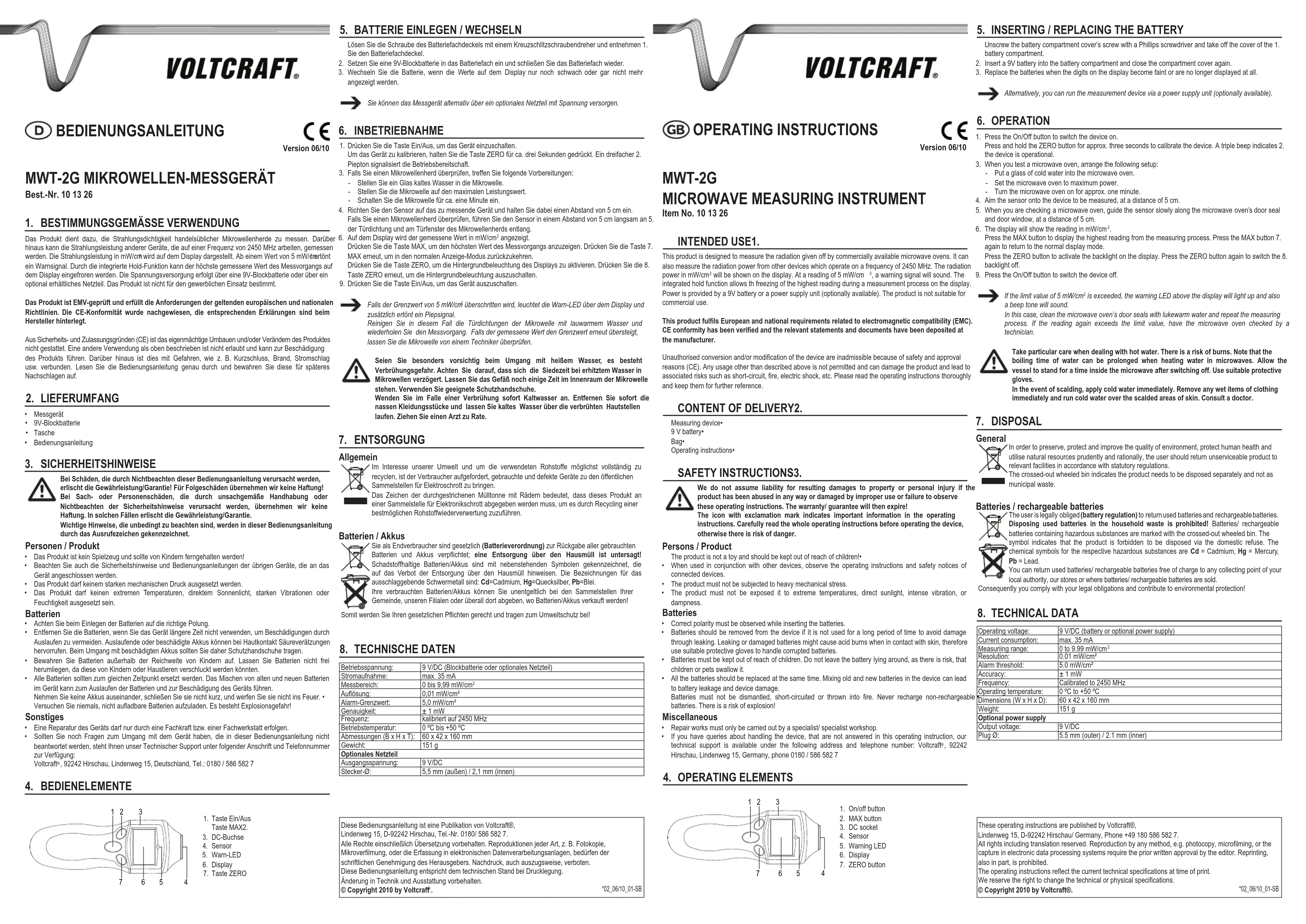 Appuyez sur la touche MAX pour afcher la valeur maximum de l’opération de mesure. Pressez à nouveau 7. sur la touche MAX pour réactiver le mode d’afchage normal. Appuyez sur la touche ZERO pour activer le rétro-éclairage de l’écran. Appuyez à nouveau sur la touche 8. ZERO pour désactiver le rétro-éclairage de l’écran.Appuyer sur la touche marche/arrêt pour arrêter l’appareil.9. En cas de dépassement de la valeur limite de 5 mW/cm , la diode d‘avertissement s‘allume sur l‘écran et un bip sonore retentit.Nettoyez dans ce cas les joints de la porte du micro-ondes à l‘eau tiède et répétez la mesure. Dans le cas où la mesure dépasse à nouveau la valeur limite, faites contrôler le micro-ondes par un technicien.Soyez prudent en manipulant l’eau chaude, vous pourriez vous brûler. Attention, la durée d’ébullition est prolongée lorsque l’eau est chauffée au four à micro-ondes. Laissez reposer le verre quelques instants dans le four avant de le retirer, et portez un gant de protection approprié.En cas de brûlure, utilisez immédiatement de l’eau froide. Retirez tout de suite le vêtement mouillé par l’eau brûlante et faites couler de l’eau froide sur la peau touchée. Demandez l’avis d’un médecin. ELIMINATION DES DÉCHETS7. Général An de préserver, protéger et améliorer la qualité de l’environnement, ainsi que de protéger la santé des êtres humains et d’utiliser prudemment les ressources naturelles, il est demandé à l’utilisateur de rapporter les appareils à mettre au rebut aux points de collecte et de recyclage appropriés en conformité avec les règlements d’application.Le logo représentant une poubelle à roulettes barrée d’une croix signie que ce produit doit être apporté à un point de collecte et de recyclage des produits électroniques pour que ses matières premières soient recyclées au mieux. Piles / accumulateurs Le consommateur nal est légalement tenu (ordonnance relative à l´élimination des piles usagées) de rapporter toutes les piles et accumulateurs usés, il est interdit de les jeter dans les ordures ménagères ! Les piles et accumulateurs qui contiennent des substances nocives sont repérés par les symboles ci-contre qui indiquent l´interdiction de les jeter dans les ordures ménagères. Les désignations pour le métal lourd prépondérant sont : Cd=cadmium, Hg=mercure, Pb=plomb. Vous pouvez rapporter gratuitement vos piles et accus usagés aux centres de récupération de votre commune, à nos succursales ou à tous les points de vente de piles et d’accumulateurs.Vous respecterez ainsi vos obligations civiles et contribuerez à la protection de l’environnement ! CARACTÉRISTIQUES TECHNIQUES8. Tension de service : 9 V/DC (monobloc ou bloc d’alimentation optionnel)Consommation de courant : max. 35 mAPlage de mesure : 0 à 9,99 mW/cm Résolution : 0,01 mW/cm²Alarme valeur limite : 5,0 mW/cm²Précision : ± 1 mWZone de fréquence : calibrée sur 2450 MHzTempérature de service : 0 ºC à +50 ºCDimensions (L x H x P) : 60 x 42 x 160 mmPoids : 151 gBloc d’alimentation optionnelTension de sortie : 9 V/DCØ de la fiche : 5,5 mm (extérieur) / 2,1 mm (intérieur)Cette notice est une publication de la société Voltcraft®, Lindenweg 15, D-92242 Hirschau/Allemagne, Tél. +49 180 586 582 7.Tous droits réservés, y compris de traduction. Toute reproduction, quelle qu’elle soit (p. ex. photocopie, microlm, saisie dans des installations de traitement de données) nécessite une autorisation écrite de l’éditeur. Il est interdit de le réimprimer, même par extraits. Cette notice est conforme à la réglementation en vigueur lors de l´impression.Données techniques et conditionnement soumis à modications sans aucun préalable.© Copyright 2010 par Voltcraft®.*02_06/10_01-SBDeze gebruiksaanwijzing is een publicatie van Voltcraft®,Lindenweg 15, D-92242 Hirschau/Duitsland, Tel. +49 180 586 582 7.Alle rechten, vertaling inbegrepen, voorbehouden. Reproducties van welke aard dan ook, bijvoorbeeld fotokopie, microverlming of de registratie in elektronische gegevensverwerkingsapparatuur, vereisen de schriftelijke toestemming van de uitgever. Nadruk, ook van uittreksels, verboden.Deze gebruiksaanwijzing voldoet aan de technische eisen bij het ter perse gaan.Wijzigingen in techniek en uitrusting voorbehouden.© Copyright 2010 bei Voltcraft®.*02_06/10_01-SB