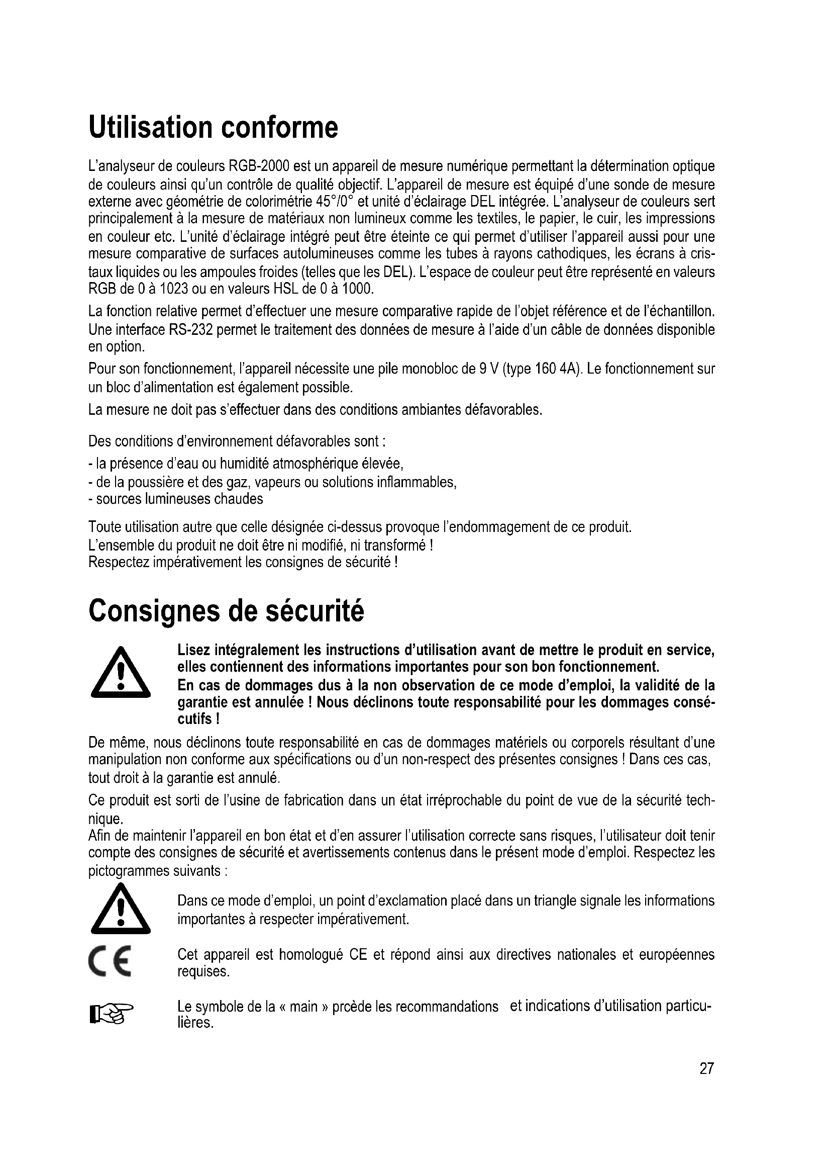 - Caractéristiques techniques Utilisation conforme L’analyseur de couleurs RGB-2000 est un appareil de mesure numérique permettant la détermination optique de couleurs ainsi qu’un contrôle de qualité objectif. L’appareil de mesure est équipé d’une sonde de mesure externe avec géométrie de colorimétrie 45°/0° et unité d’éclairage DEL intégrée. L’analyseur de couleurs sert principalement à la mesure de matériaux non lumineux comme les textiles, le papier, le cuir, les impressions en couleur etc. L’unité d’éclairage intégré peut être éteinte ce qui permet d’utiliser l’appareil aussi pour une mesure comparative de surfaces autolumineuses comme les tubes à rayons cathodiques, les écrans à cris- taux liquides ou les ampoules froides (telles que les DEL). L’espace de couleur peut être représenté en valeurs RGB de 0 à 1023 ou en valeurs HSL de 0 à 1000. La fonction relative permet d’effectuer une mesure comparative rapide de l’objet référence et de l’échantillon. Une interface RS-232 permet le traitement des données de mesure à l’aide d’un câble de données disponible en option. Pour son fonctionnement, l’appareil nécessite une pile monobloc de 9 V (type 160 4A). Le fonctionnement sur un bloc d’alimentation est également possible. La mesure ne doit pas s’effectuer dans des conditions ambiantes défavorables. Des conditions d’environnement défavorables sont : - la présence d’eau ou humidité atmosphérique élevée, - de la poussière et des gaz, vapeurs ou solutions inflammables, - sources lumineuses chaudes Toute utilisation autre que celle désignée ci-dessus provoque l’endommagement de ce produit. L’ensemble du produit ne doit être ni modifié, ni transformé ! Respectez impérativement les consignes de sécurité ! Consignes de sécurité Lisez intégralement les instructions d’utilisation avant de mettre le produit en service, elles contiennent des informations importantes pour son bon fonctionnement. En cas de dommages dus à la non observation de ce mode d’emploi, la validité de la garantie est annulée ! Nous déclinons toute responsabilité pour les dommages consé- cutifs ! De même, nous déclinons toute responsabilité en cas de dommages matériels ou corporels résultant d’une manipulation non conforme aux spécifications ou d’un non-respect des présentes consignes ! Dans ces cas, tout droit à la garantie est annulé. Ce produit est sorti de l’usine de fabrication dans un état irréprochable du point de vue de la sécurité tech- nique. Afin de maintenir l’appareil en bon état et d’en assurer l’utilisation correcte sans risques, l’utilisateur doit tenir compte des consignes de sécurité et avertissements contenus dans le présent mode d’emploi. Respectez les pictogrammes suivants : Dans ce mode d’emploi, un point d’exclamation placé dans un triangle signale les informations importantes à respecter impérativement. Cet appareil est homologué CE et répond ainsi aux directives nationales et européennes requises. Le symbole de la « main » prcède les recommandations et indications d’utilisation particu- lières. p. 3627