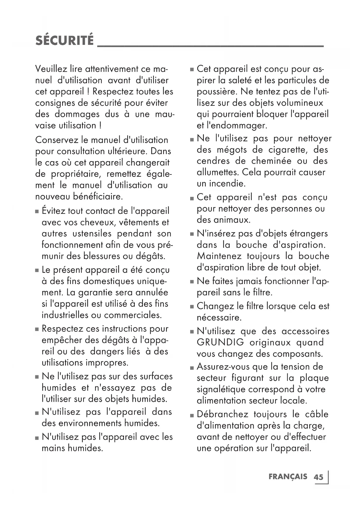 Nos appareils ménagers de marque GRUNDIG respectent toutes les normes de sécurité applicables. En conséquence, si le produit venait à être endom- magé, faites-le remplacer par le revendeur, son service après- vente, une personne de qualifica- tion semblable ou une personne agréée, afin d'éviter tout risque. Des réparations défectueuses et non professionnelles peuvent être sources de danger et de risque pour l'utilisateur.